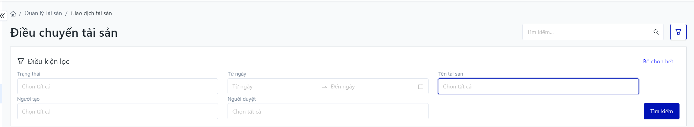I. Các điều kiện lọc và tìm kiếm phiếu điều chuyển tài sản![]()