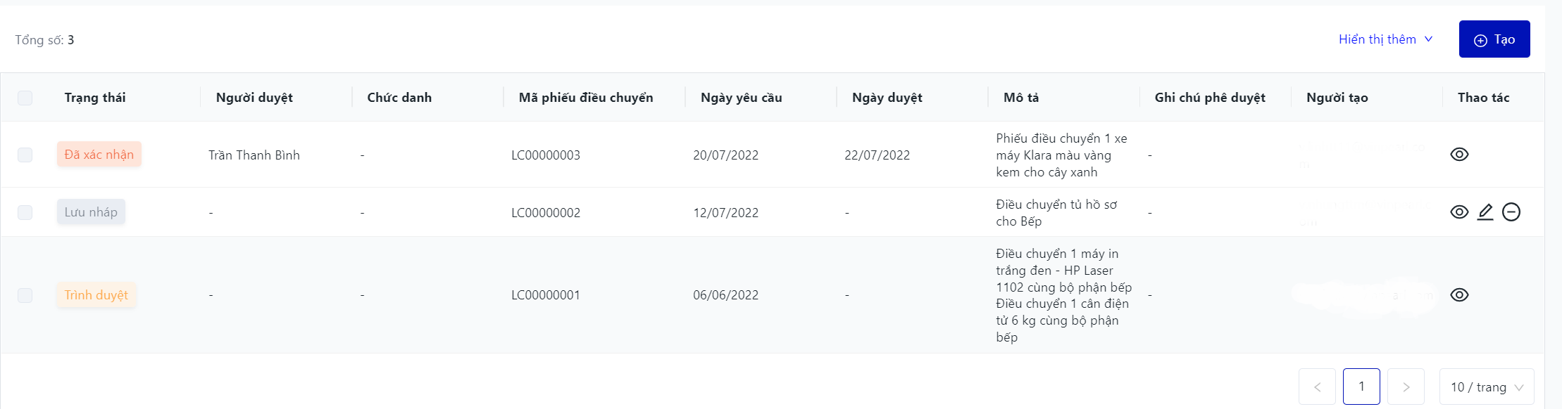 Màn hình hiển thị toàn bộ danh sách các phiếu điều chuyển của cơ sở |