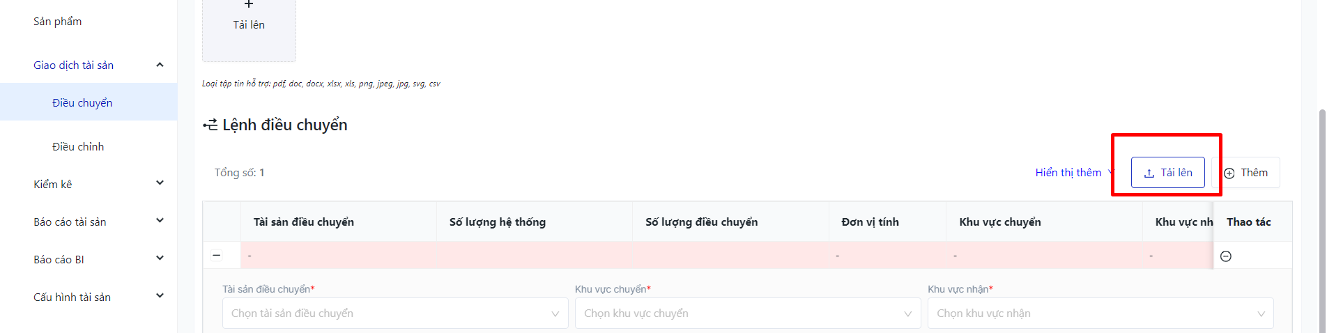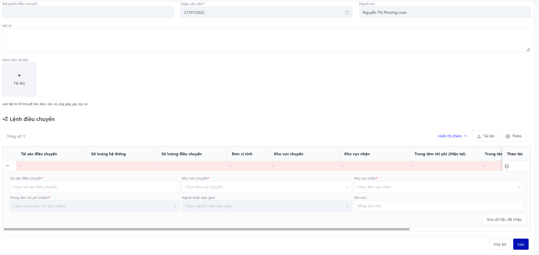 -Khu vực chuyển: điền thông tin mã tên khu vực chức năng chuyển -Khu vực nhận: điền thông tin mã tên khu vực chức năng nhận -Mã tài sản: điền mã tài sản -Trạng thái tài sản: điền trạng thái tài sản -Số lượng tài sản: điền số lượng tài sản điều chuyển -Trung tâm chi phí mới: điền thông tin mã tên TTCP mới -Người nhận bàn giao: điền người nhận bàn giao