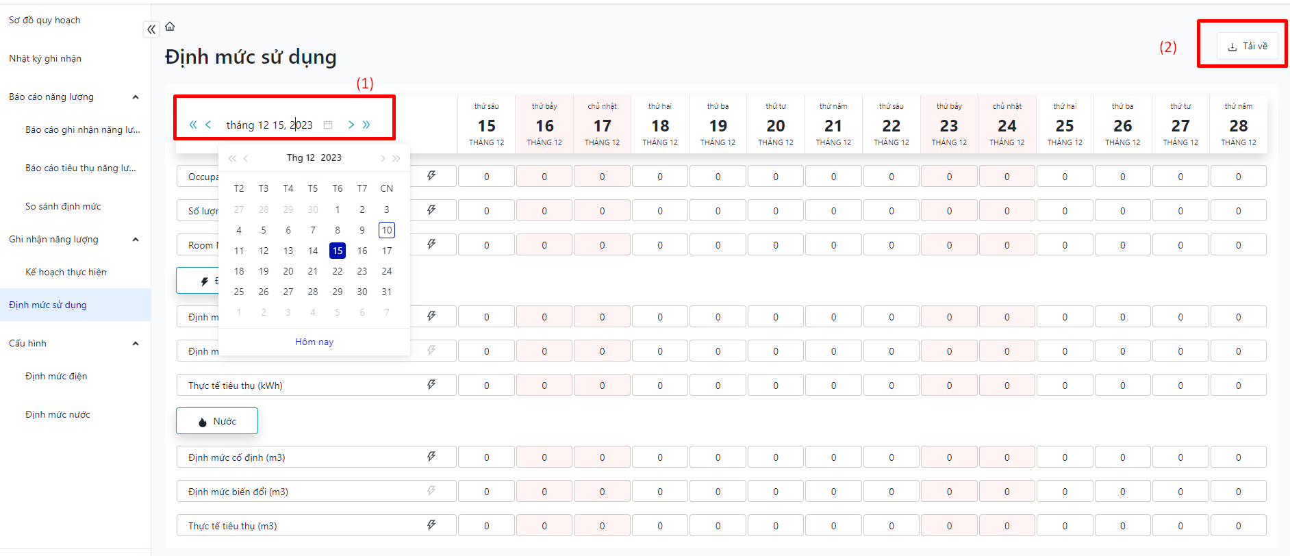 Đăng nhập → Quản lý năng lượng → Định mức sử dụng |