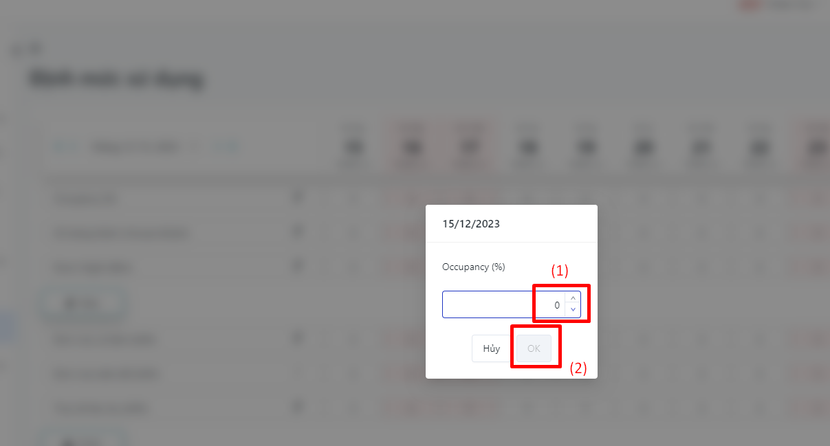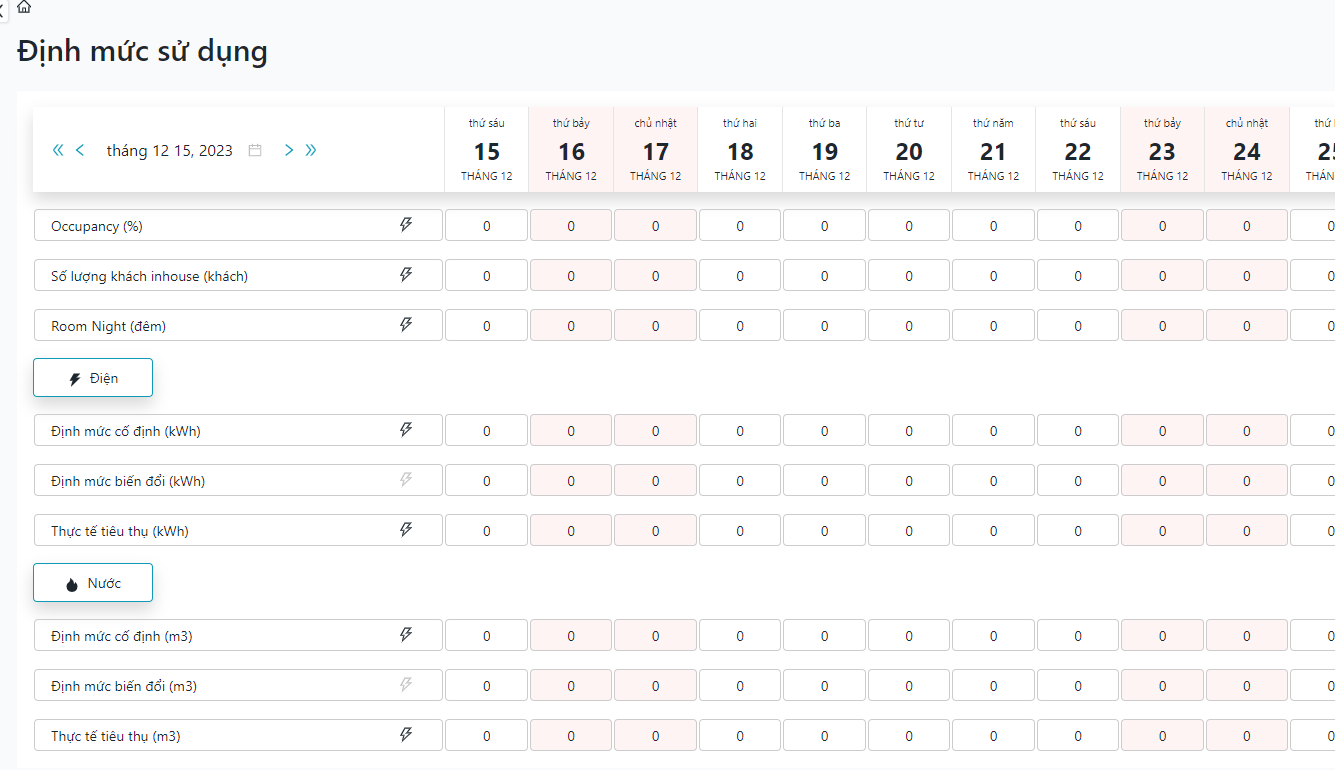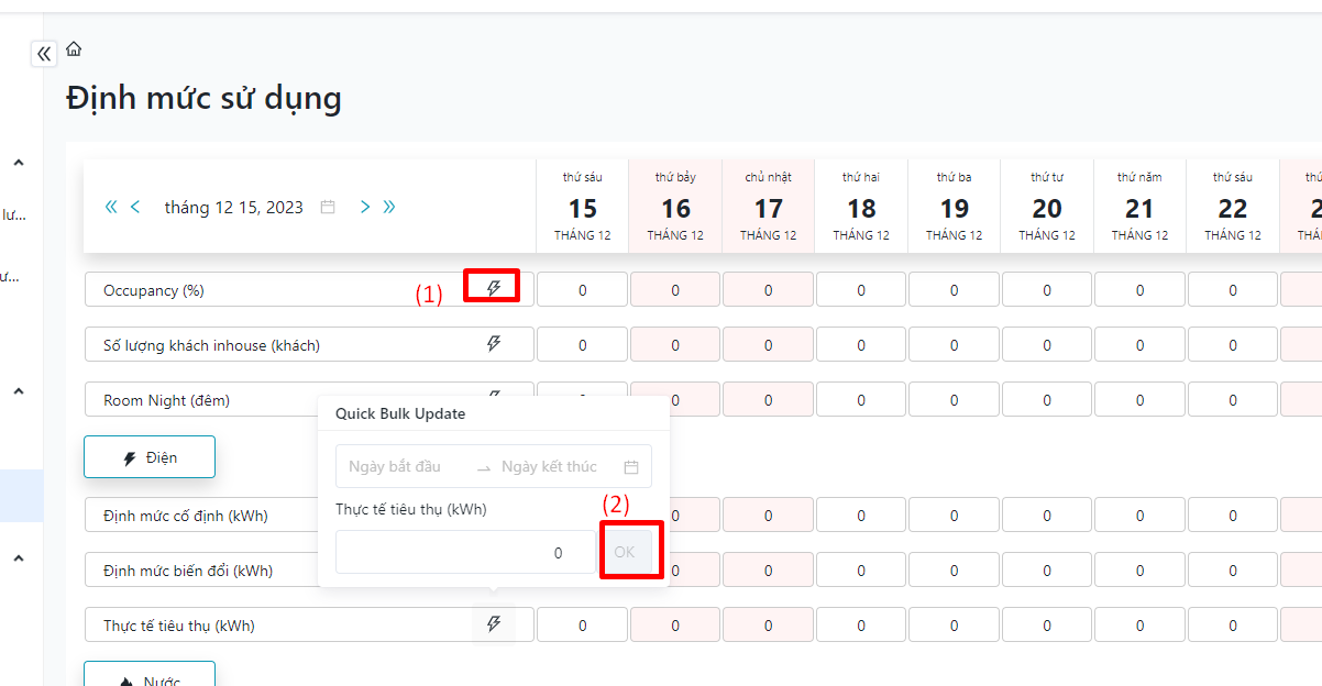 ![]() Người dùng được thiết lập theo ngày cho các chỉ số (occupanacy, số lượng khách inhouse, Room Night đêm, Định mức cố định, Thực tế tiêu thụ) bằng cách click chuột vào ngày cần cập nhập, sau đó điền chỉ số và nhấn chọn OK. ![]() Người dùng được thiết lập hàng loạt chỉ số (occupanacy, số lượng khách inhouse, Room Night đêm, Định mức cố định, Thực tế tiêu thụ) cho các ngày, bằng cách click chuột vào biểu tượng Bulk Update, sau đó điền thông tin và nhấn chọn OK. ![]() Người dùng sẽ được xem các thông tin sau: