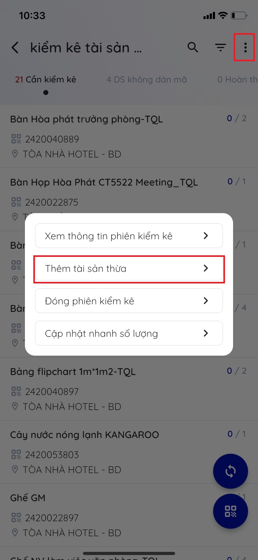 2.Thêm tài sản thừa trong quá trình kiểm kê