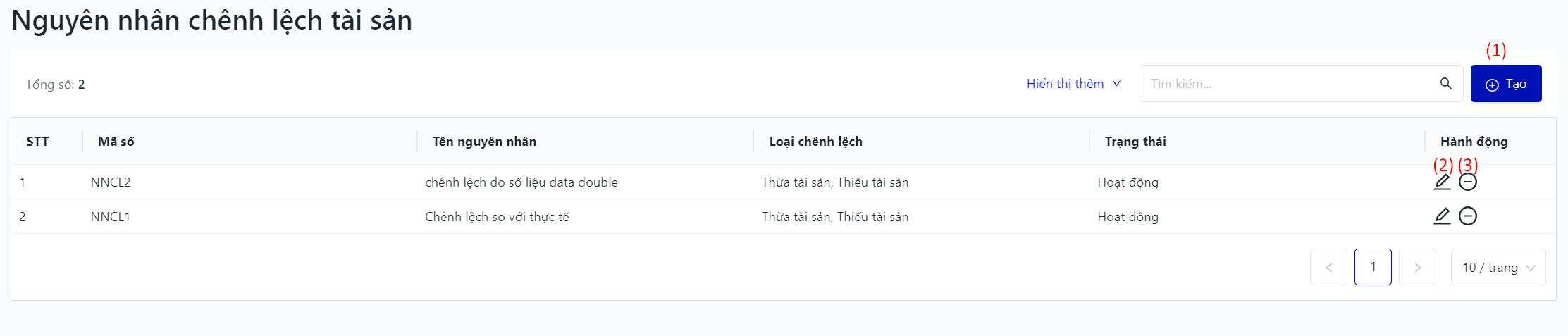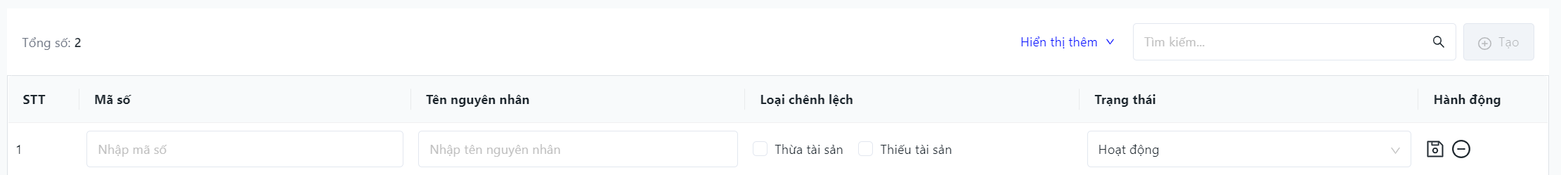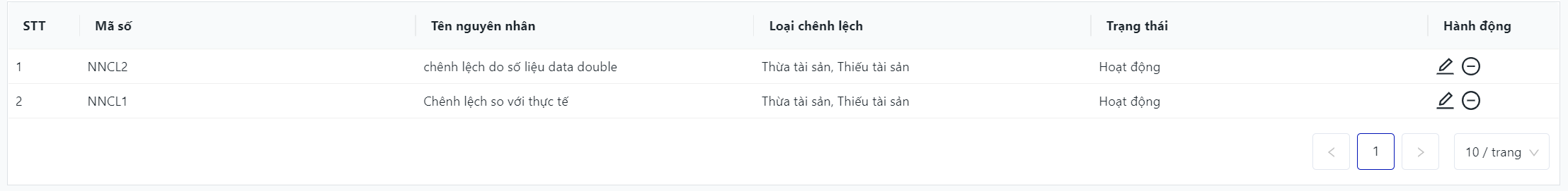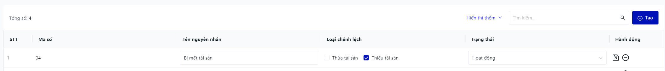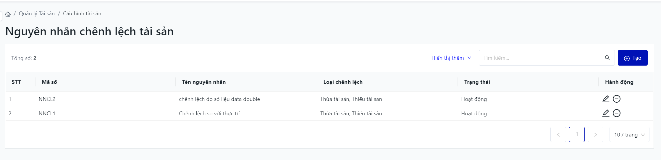 Màn hình hiển thị toàn bộ danh sách cấu hình nguyên nhân chênh lệch tài sản của cơ sở |