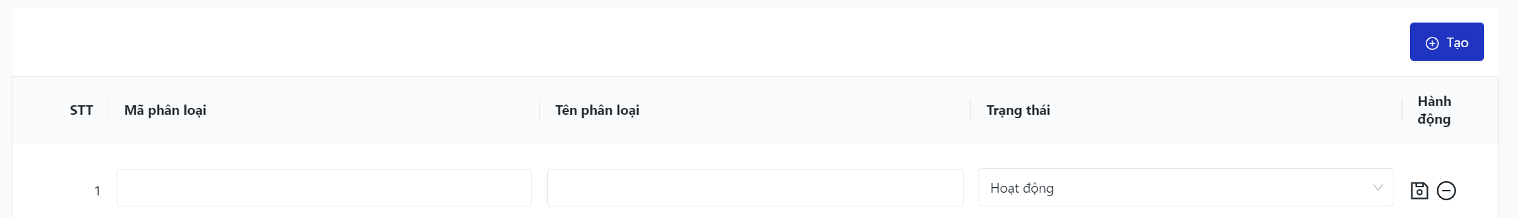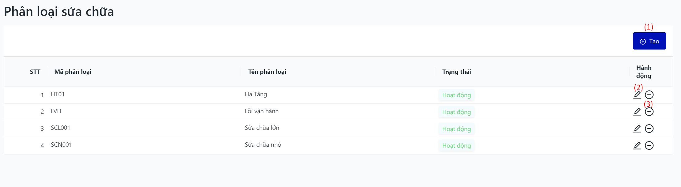 Màn hình hiển thị toàn bộ danh sách phân loại sửa chữa của cơ sở |