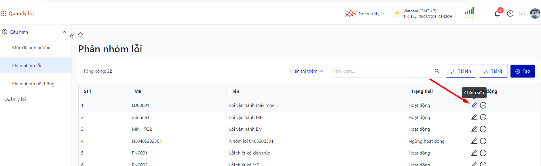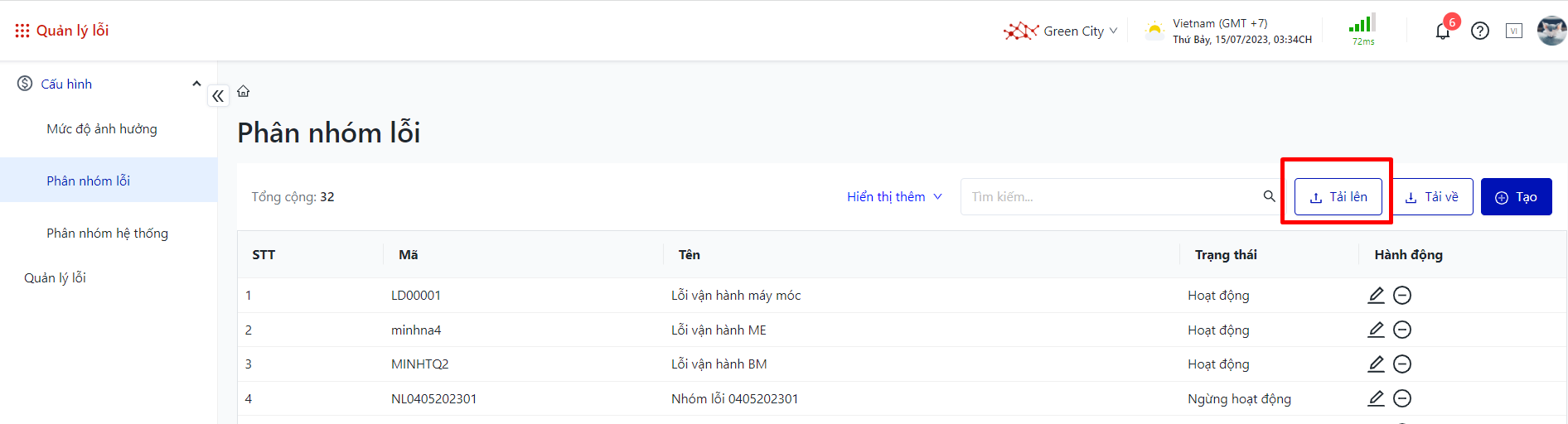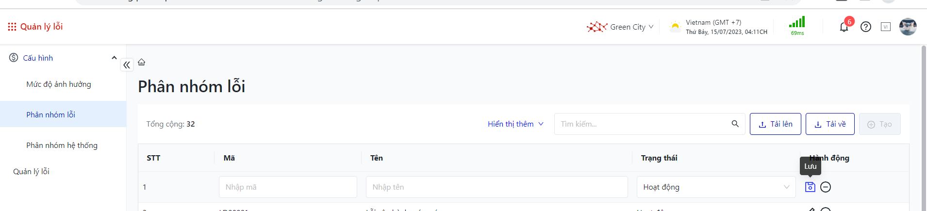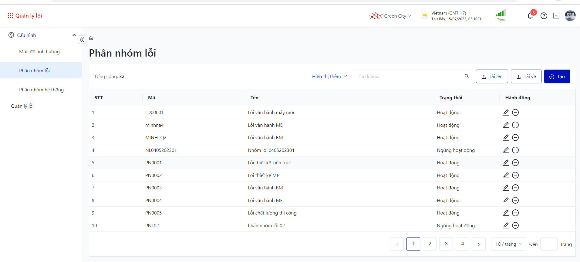 Đăng nhập – Quản lý lỗi – Cấu hình – Phân nhóm lỗi |