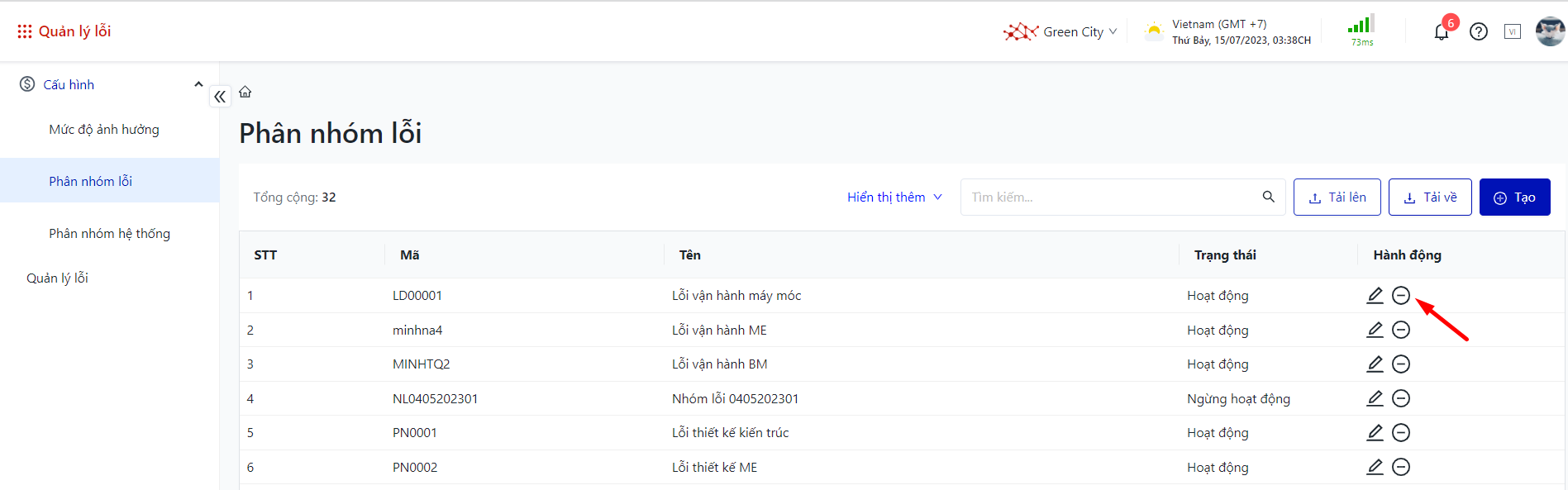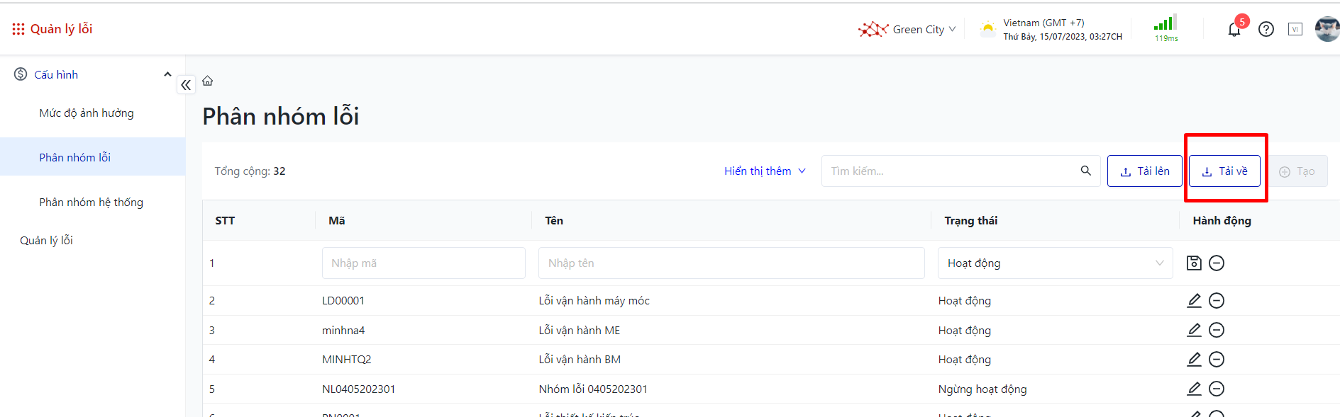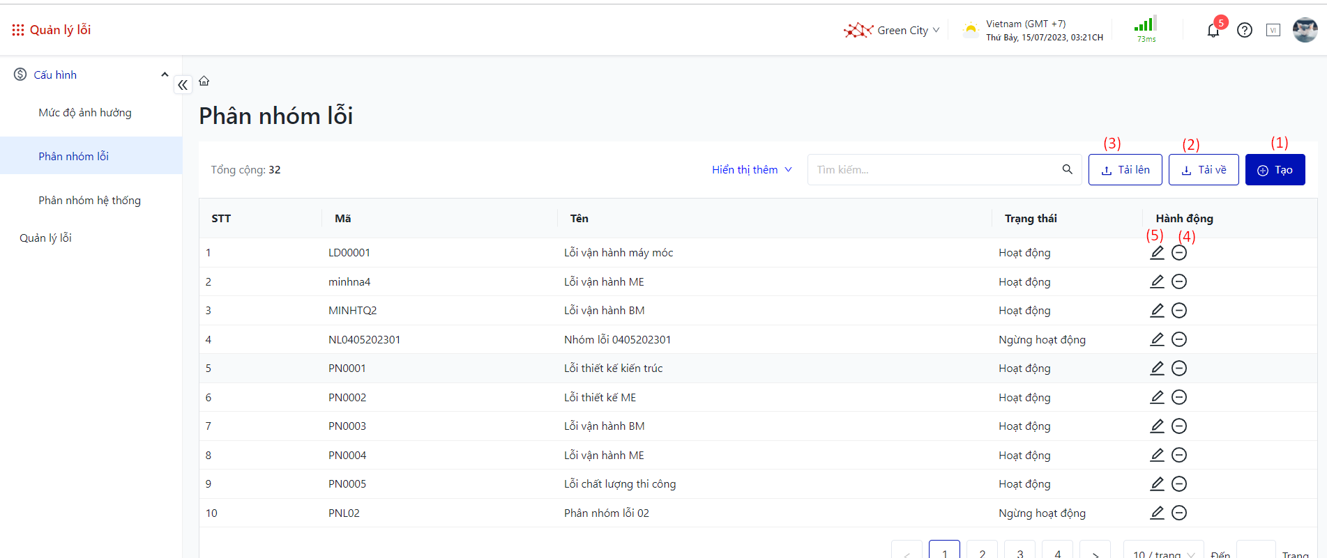 Đăng nhập – Quản lý lỗi – Cấu hình – Phân nhóm lỗi |