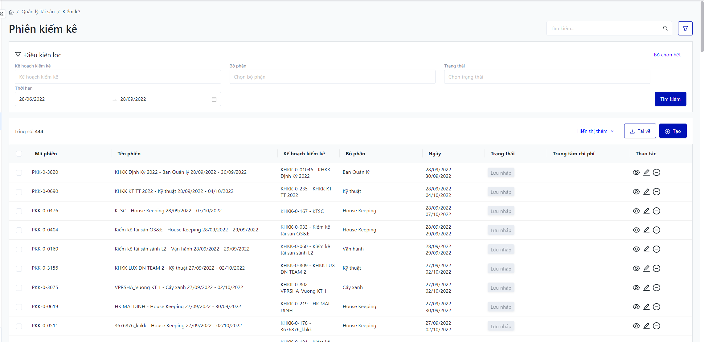 Lưu ý:Trong 1 năm thường chỉ diễn ra vài lần kiểm kê, hệ thống mặc định hiển thị danh sách phiên kiểm kê trong vòng 3 tháng gần nhất nên sẽ xảy ra tình trạng khi user vào check lại thì không thấy list danh sách các phiên kiểm kê đã tạo nếu quá 3 tháng. Khi ấy người dùng phải filter lại “Thời hạn” và nhập khoảng thời gian hợp lí (có thể lấy ngày bắt đầu từ 01/01/yyyy - hiện tại) thì sẽ xem được danh sách đã tạo trước đó.