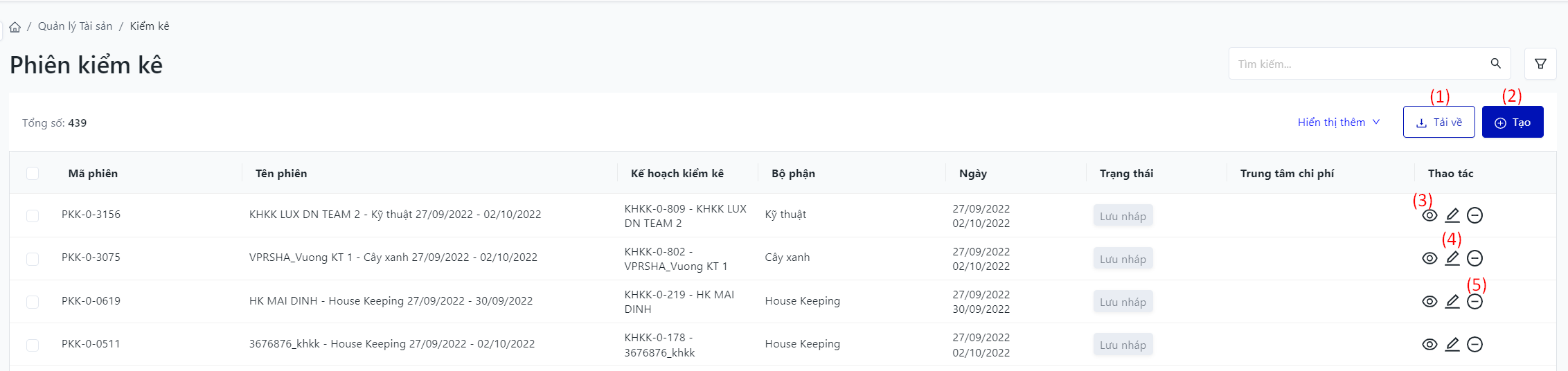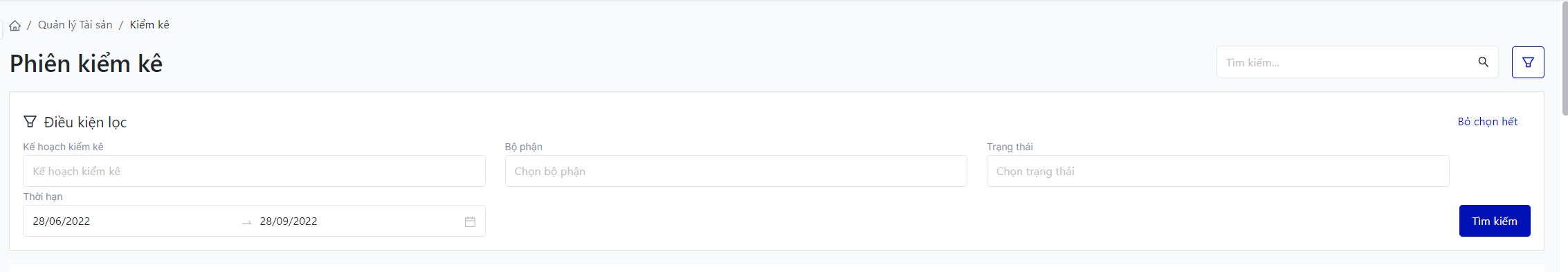 Phần tìm kiếm: Người dùng có thể tìm kiếm theo mã phiên kiểm kê, tên phiên kiểm kê