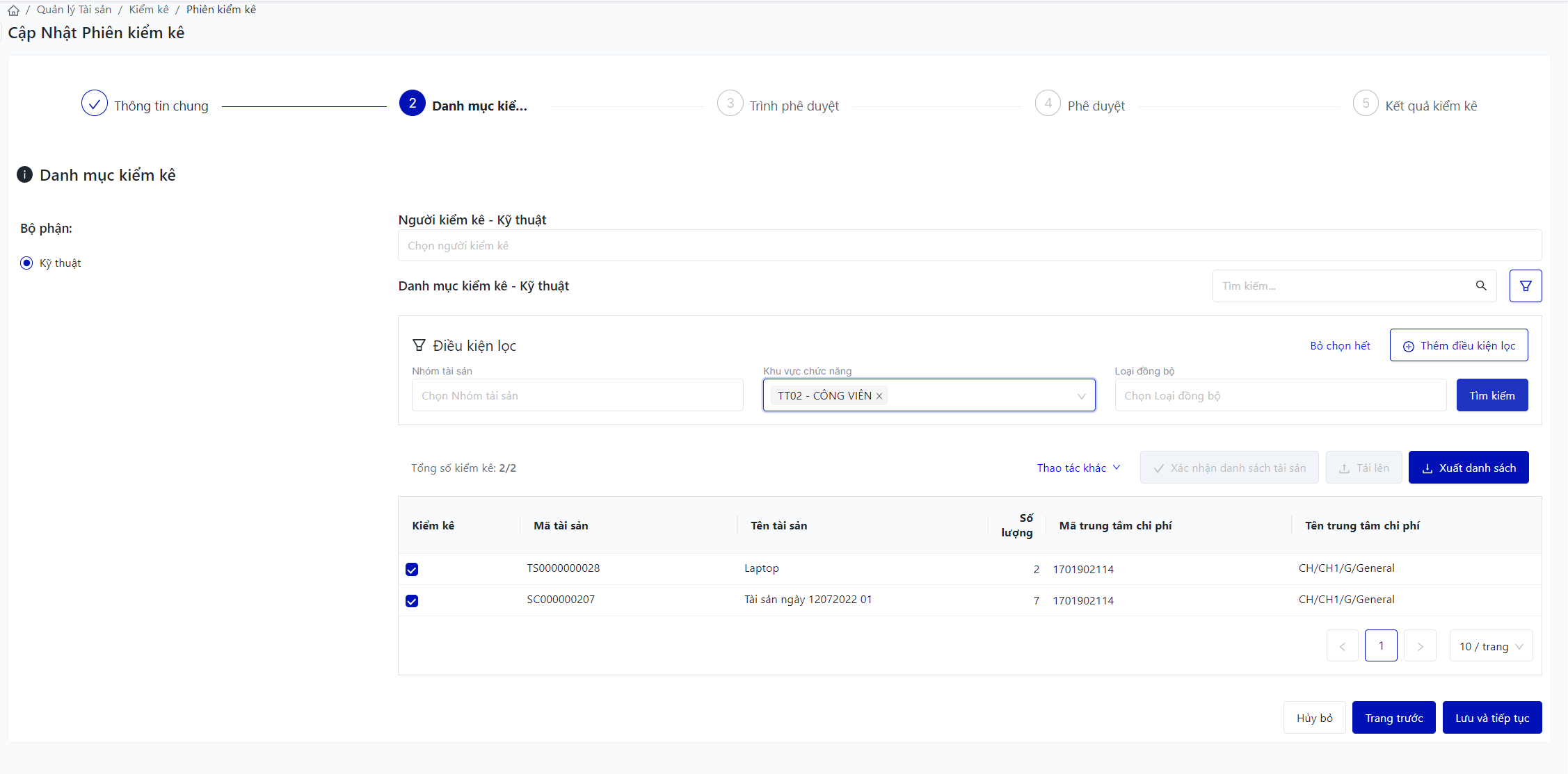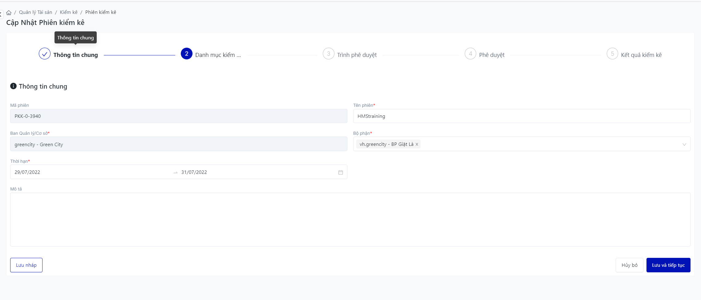 Nhập đầy đủ các trường thông tin có dấu sao tương tự các trường thông tin ở phần tạo kế hoạch kiểm kê, chọn lưu và tiếp tục để sang bước 2
