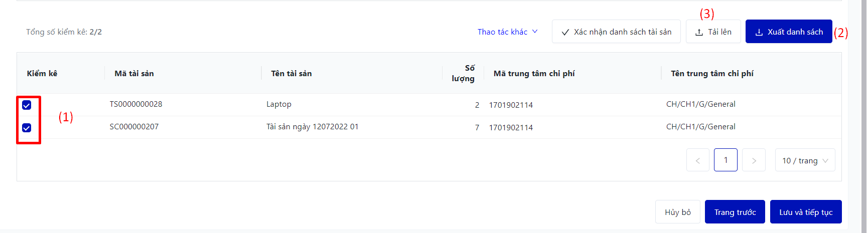 Ngoài ra, người dùn có thể chọn xuất danh sách (2) để xuất file tài sản theo định dạng file excel để kiểm tra lại toàn bộ thông tin trước khi xác nhận danh sách tài sản