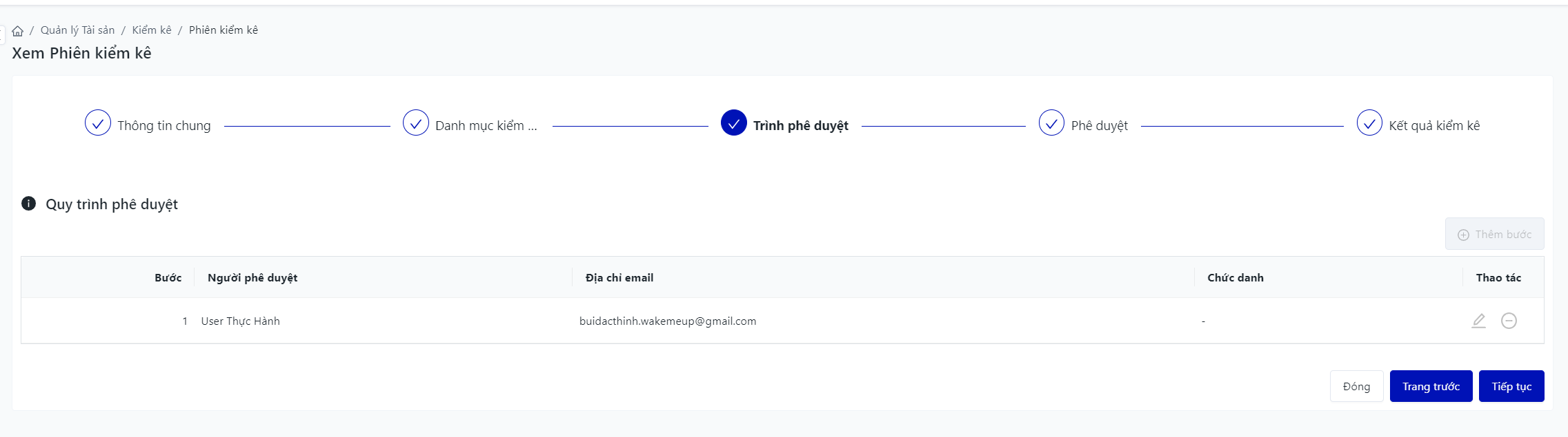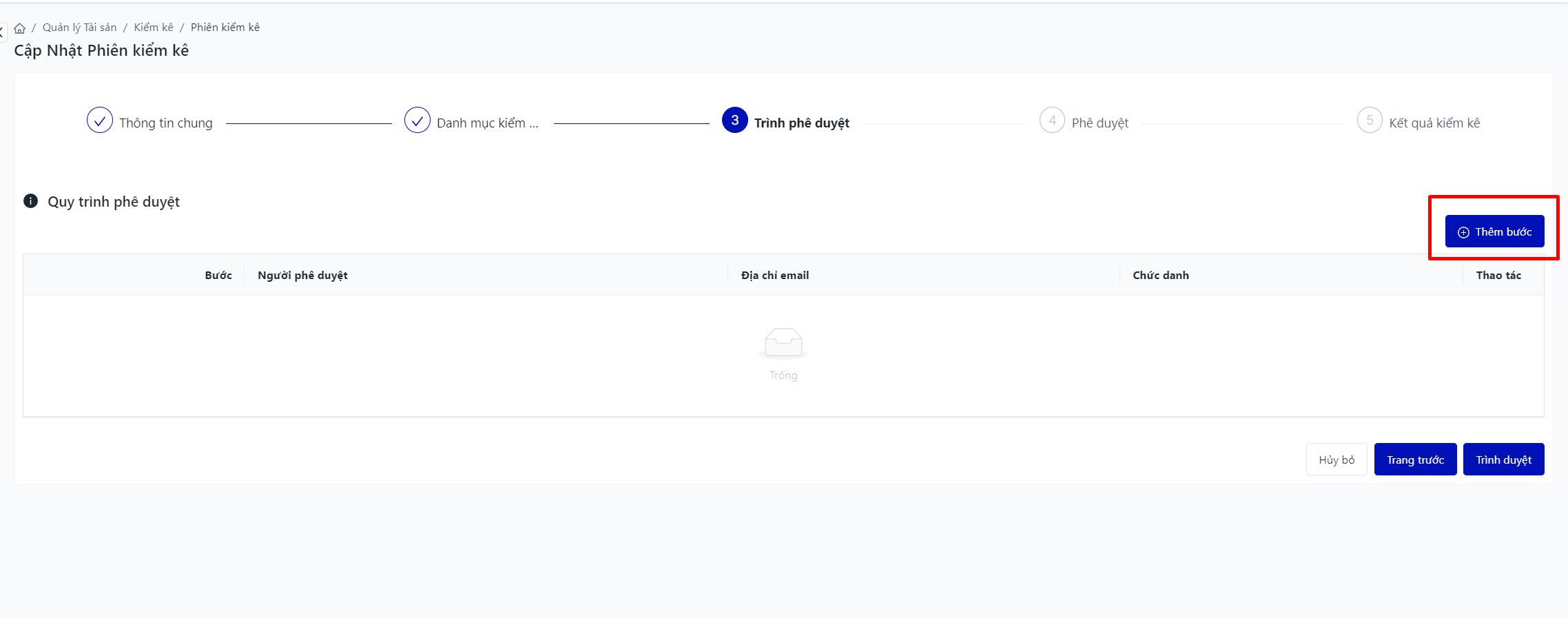 (3) Trình phê duyệt: Chọn thêm bước để thêm người phê duyệt phiên kiểm kê, có thể thêm nhiều người phê duyệt trong 1 phiên.