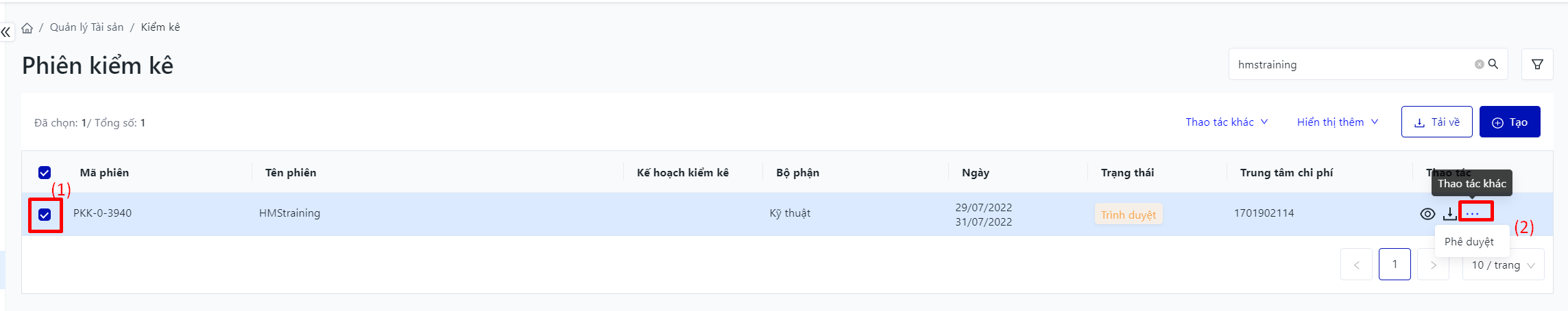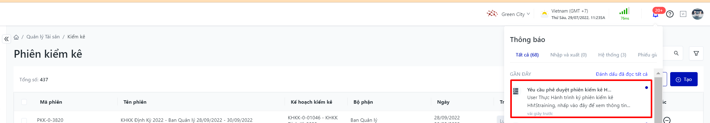 Người phê duyệt có thể nhấn vào thông báo hoặc vào chi tiết phiên kiểm kê để thao tác phê duyệt/ từ chối