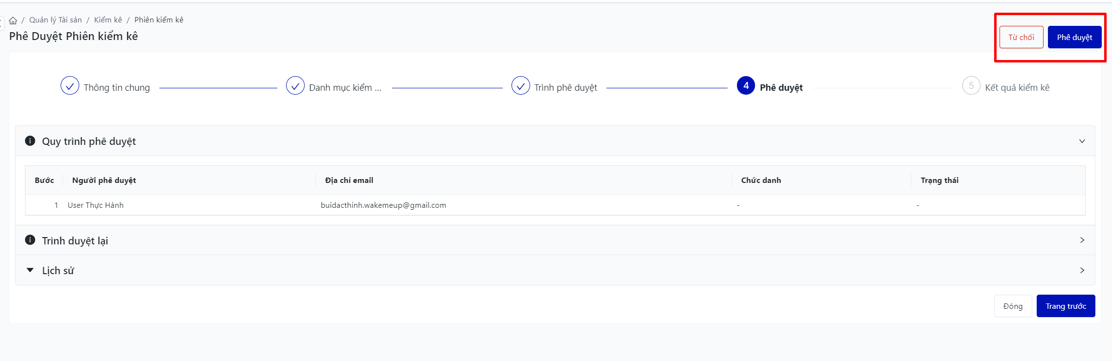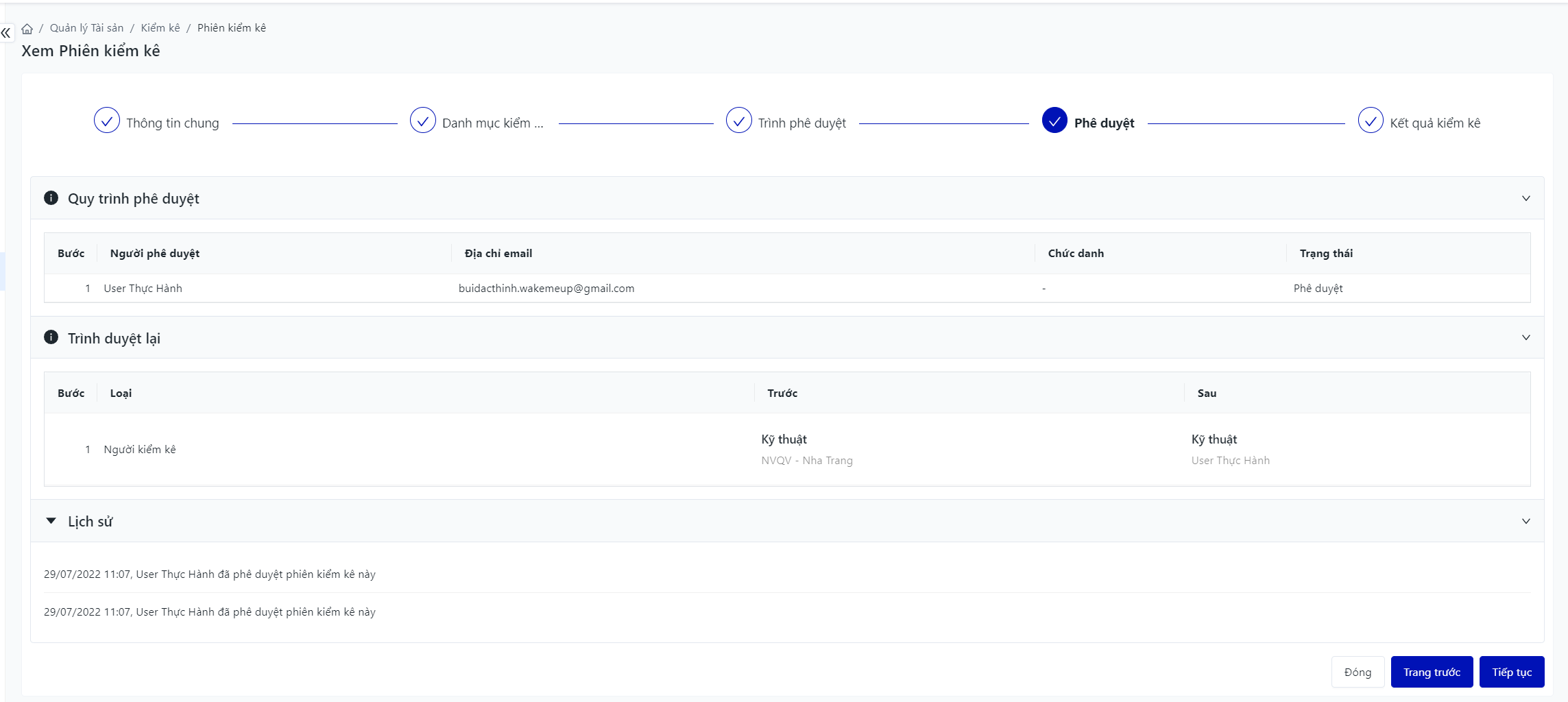 Đã từ chối: Sau khi người phê duyệt từ chối phiên kiểm kê. Ở trạng thái này, người dùng có thể thao tác chỉnh sửa thông tin sau đó trình duyệt lại.
