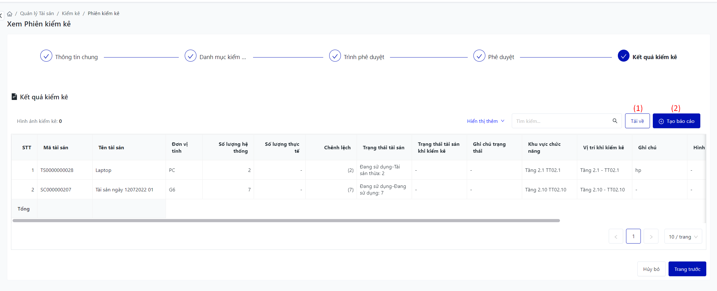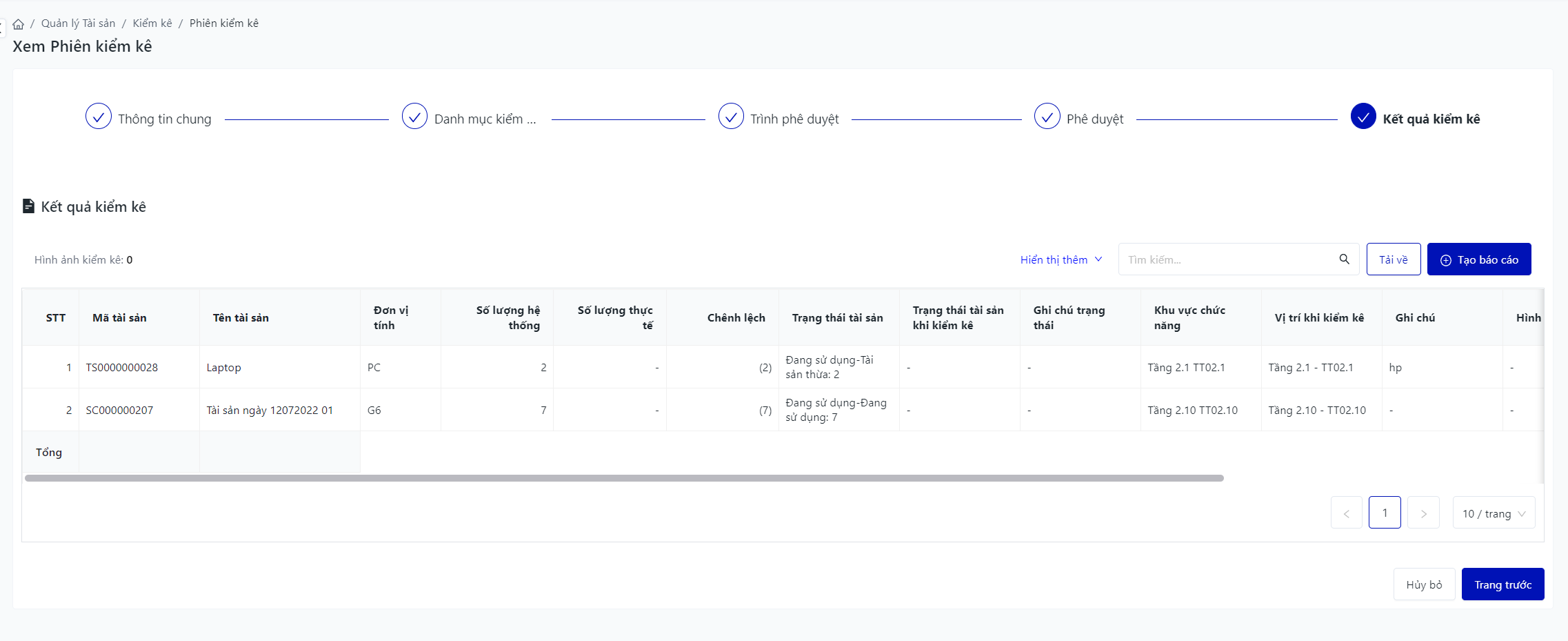 (2) Chọn Tạo báo cáo để tạo báo cáo kiểm kê. Chi tiết ở phần báo cáo kiểm kê