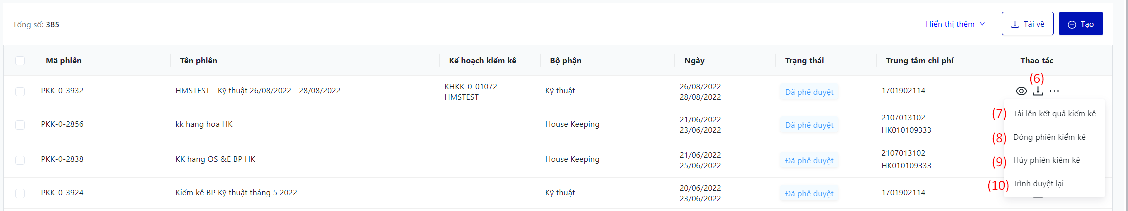 (6) Tải về kết quả kiểm kê: Chọn tải về kết quả kiểm kê để xuất file kết quả kiểm kê nhanh ngay tại màn hình danh sách phiên kiểm kê