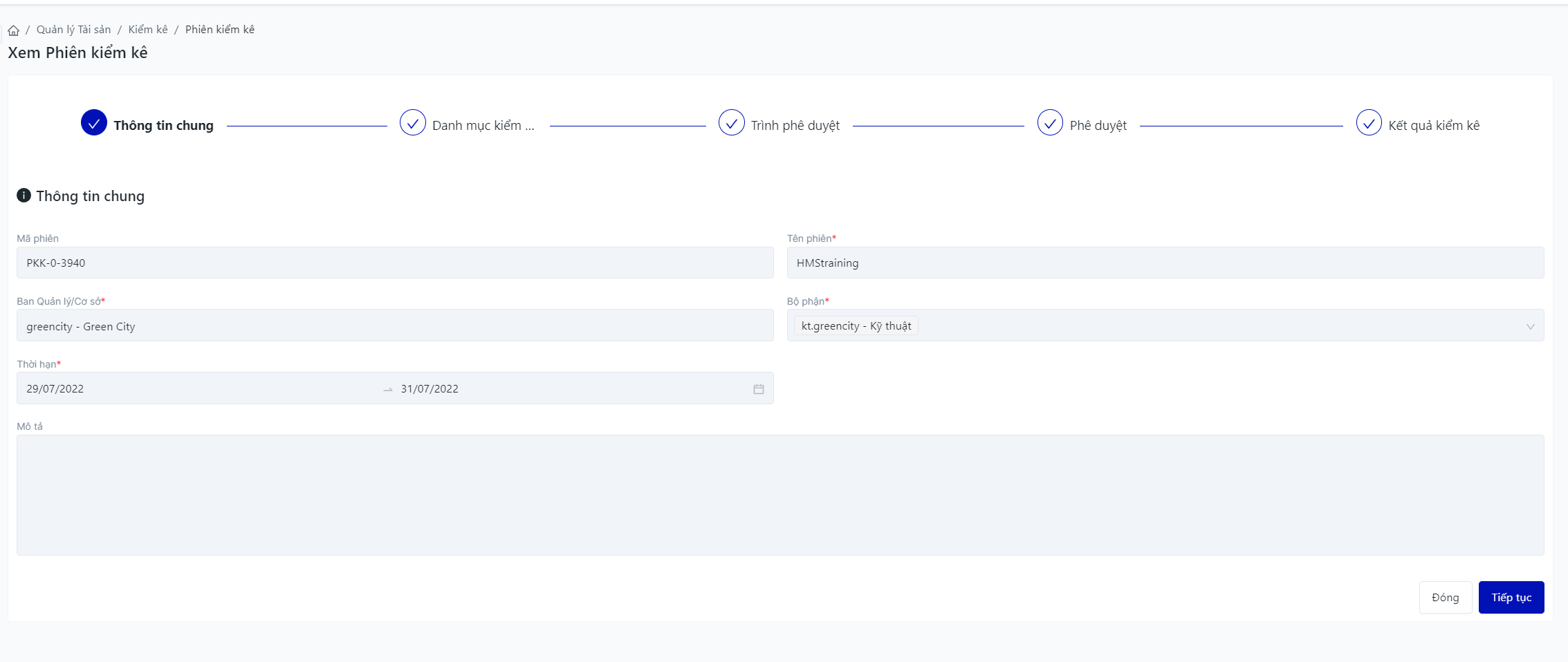 Đã đóng phiên: Sau khi người được phân công đi kiểm kê hoàn thành công việc kiểm kê tài sản và đóng phiên kiểm kê trên Mobile App, hệ thống sẽ chuyển sang trạng thái đóng phiên trên web.
