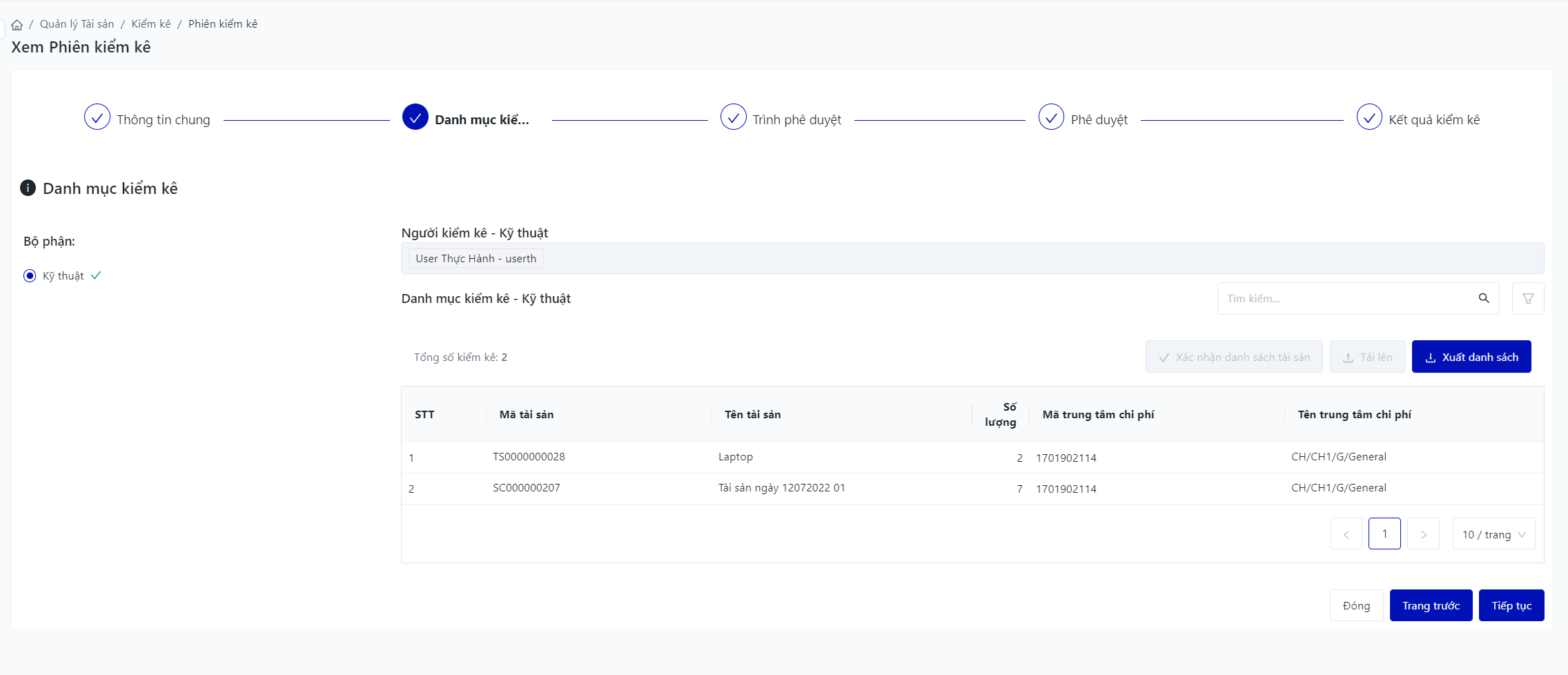 Sau khi kiểm tra danh sách tài sản cần được kiểm kê trong phiên này, người dùng chọn Xác nhận danh sách tài sản để thực hiện các bước tiếp theo