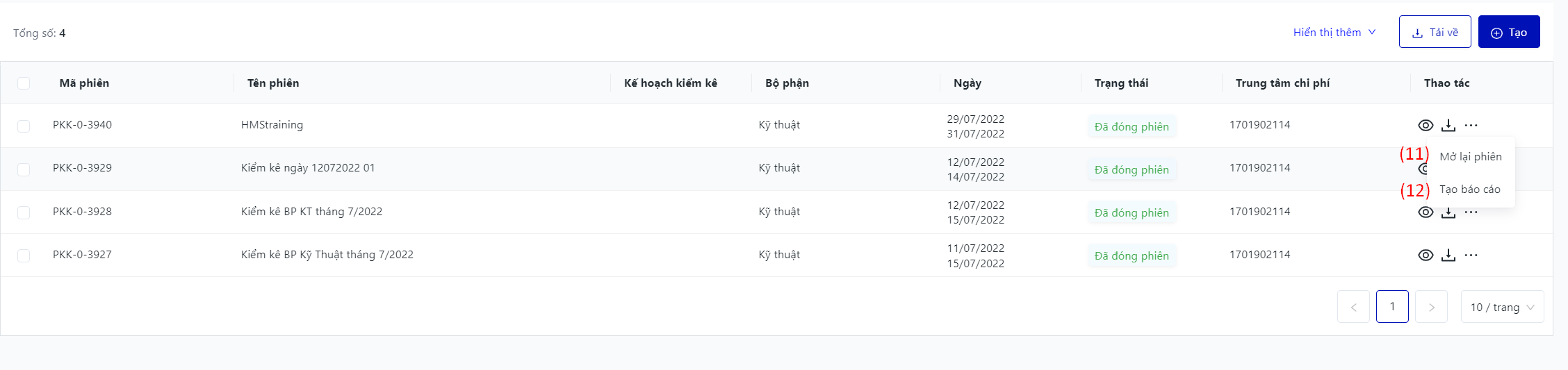 (11) Mở lại phiên: Trong trường hợp có sai sót trong quá trình kiểm kê hoặc sai kết quả kiểm kê, người dùng có thể thao tác mở lại phiên để tiếp tục thực hiện/ chỉnh sửa phiên kiểm kê.