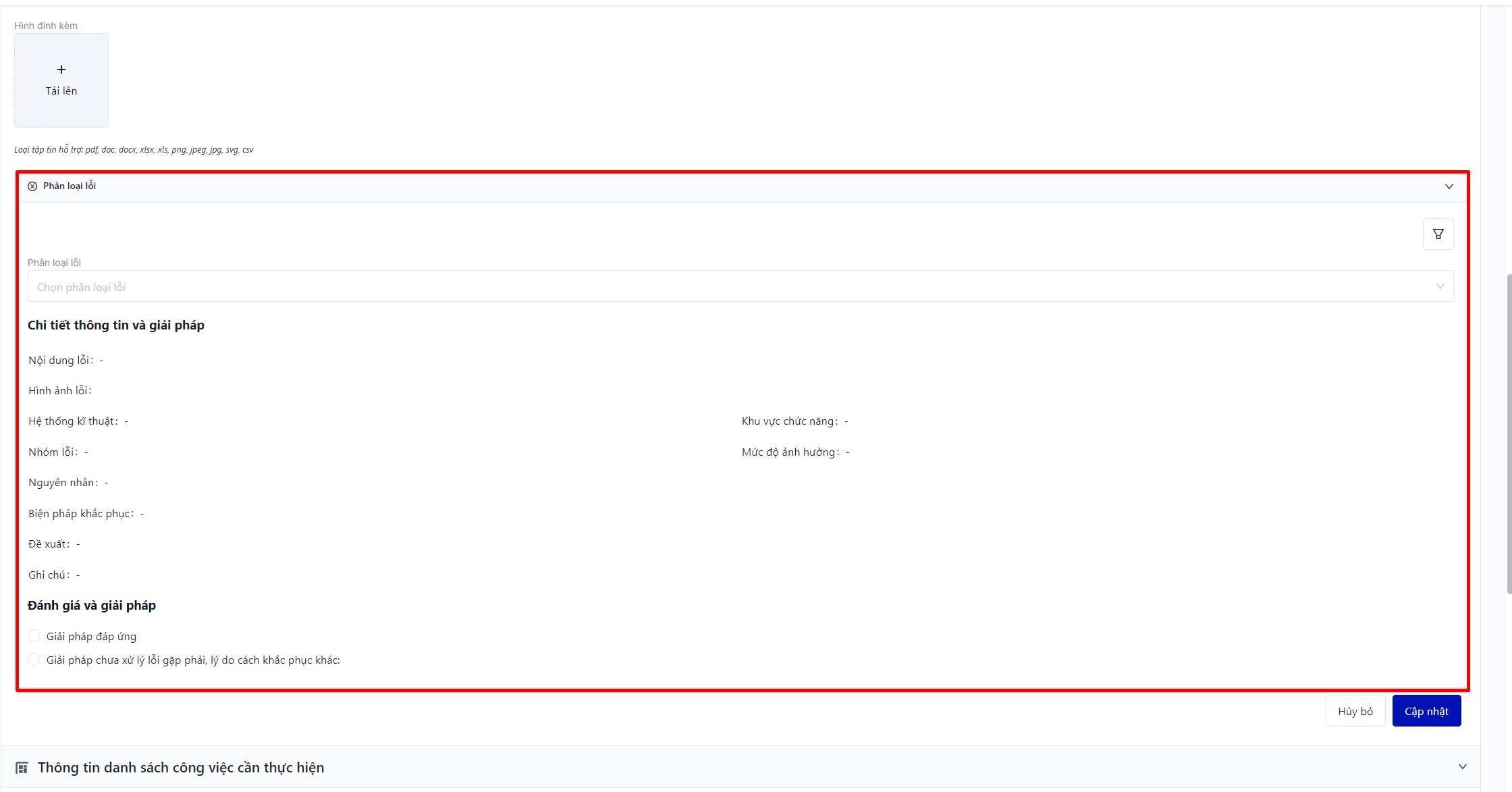 ![]() Danh sách phân loại lỗi đã được cấu hình ở mục Quản lý lỗi (Fault Management), người dùng khi thực hiện công việc có liên quan đến thông tin phân loại lỗi nào thì chỉ cần chọn vào đúng phân loại lỗi đó ![]()