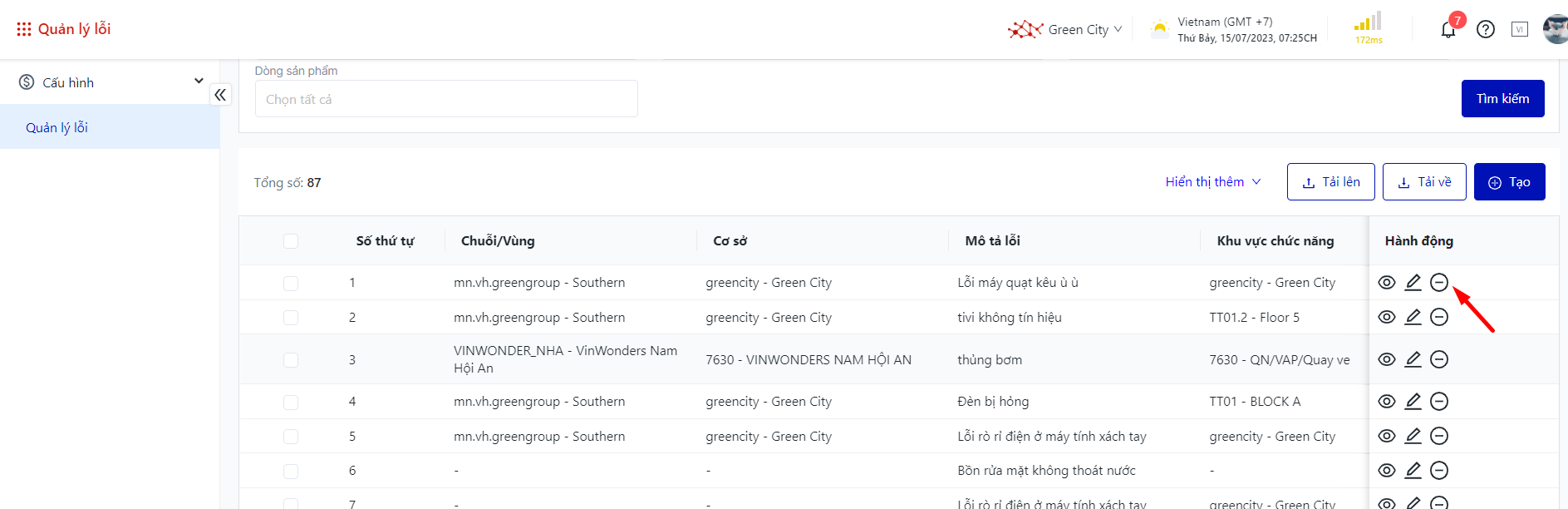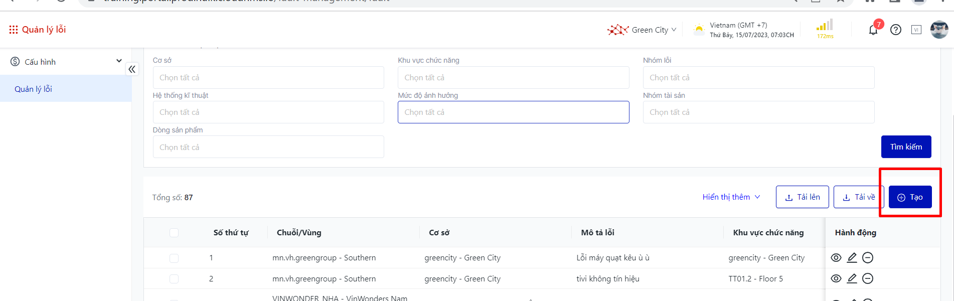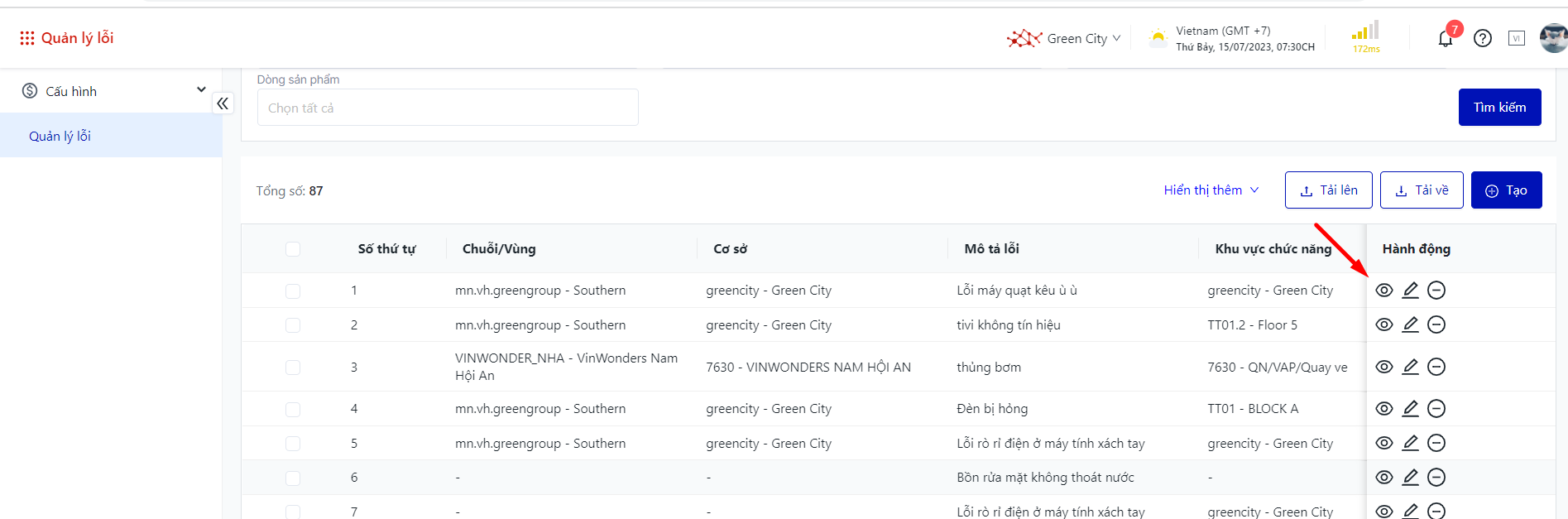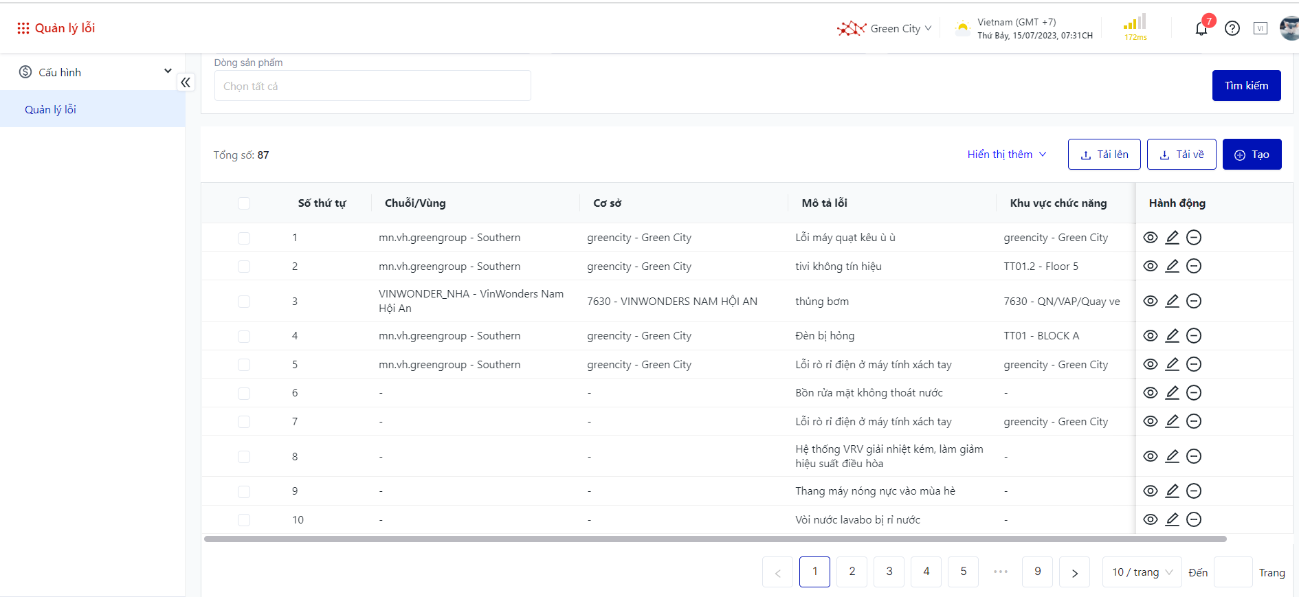 Màn hình hiển thị toàn bộ lỗi được áp dụng tại cơ sở |