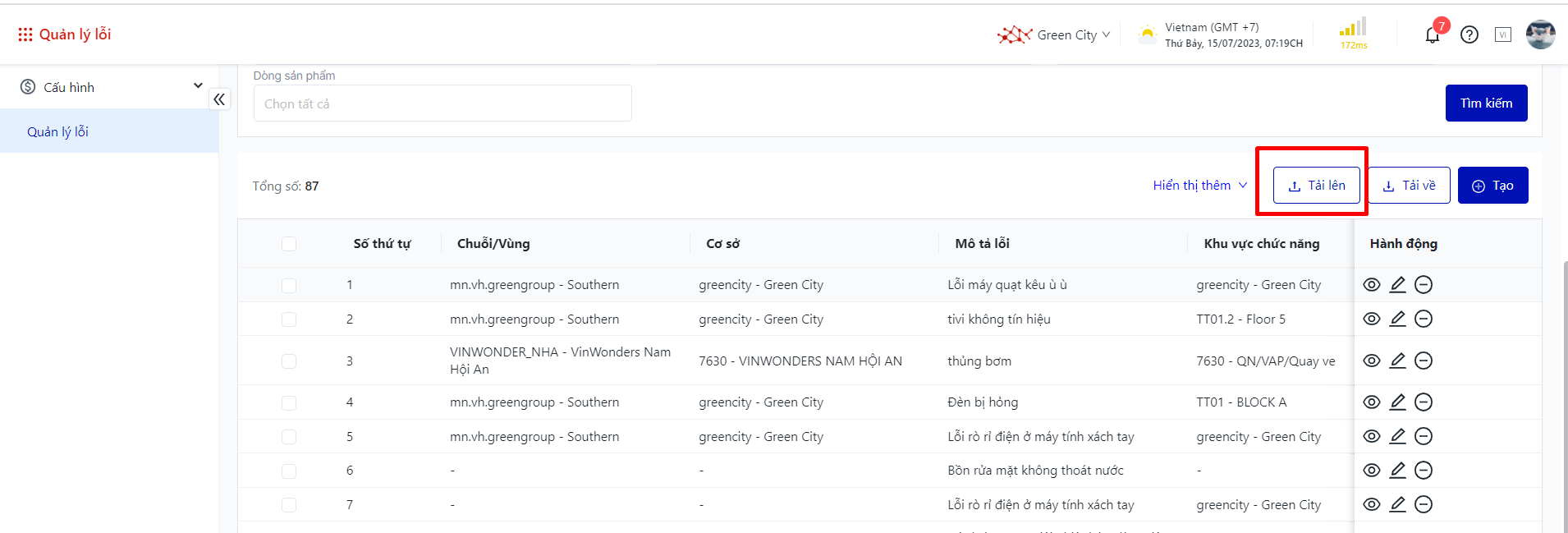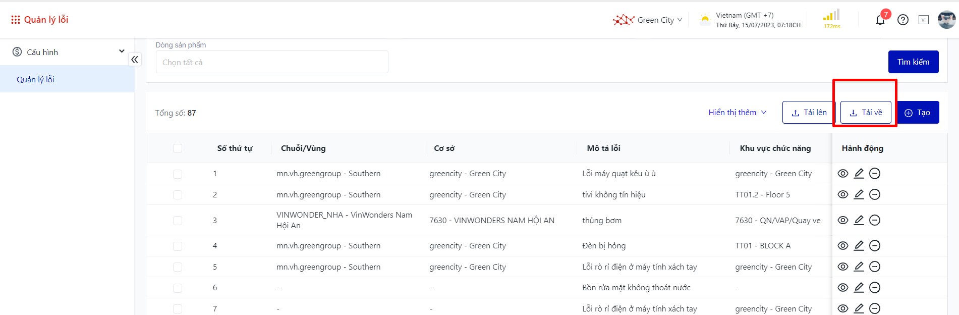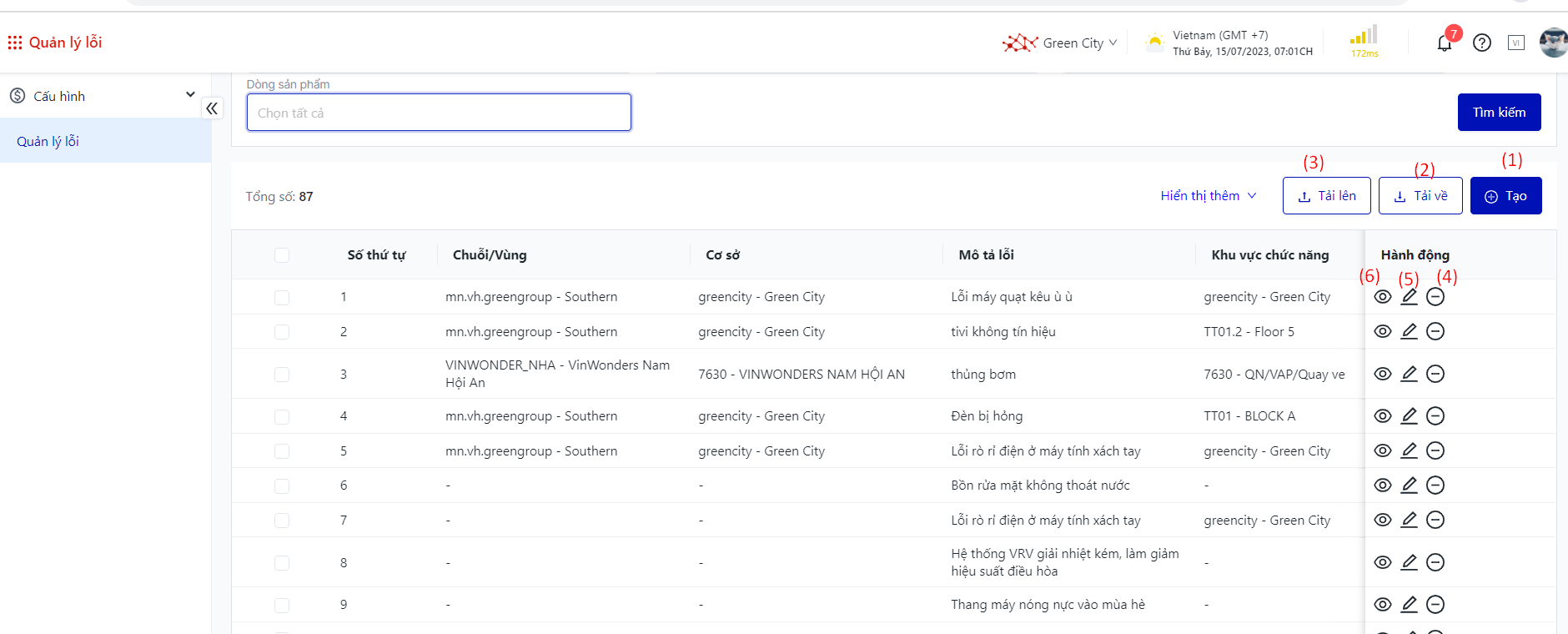 Màn hình hiển thị toàn bộ lỗi được áp dụng tại cơ sở |