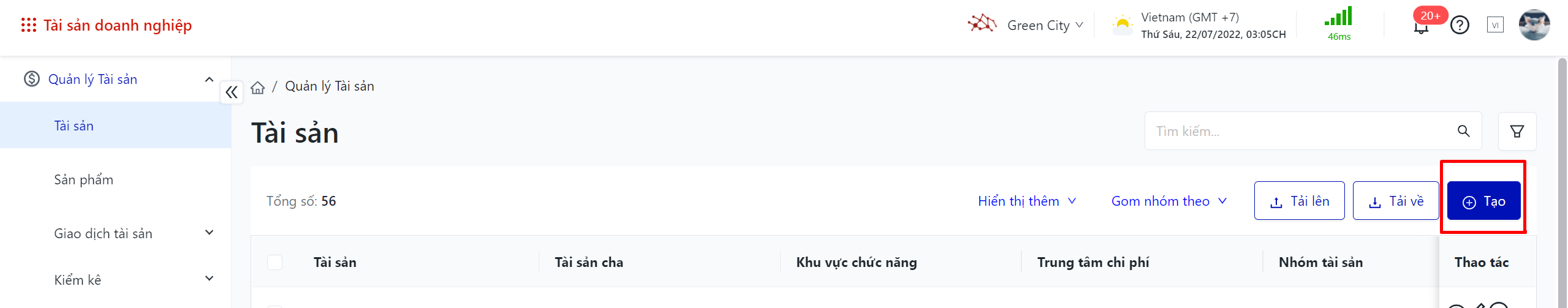 Tải lên file tạo mới nhiều tài sản: Khi cần tạo mới hàng loạt tài sản, người dùng có thể sử dụng chức năng tải lên