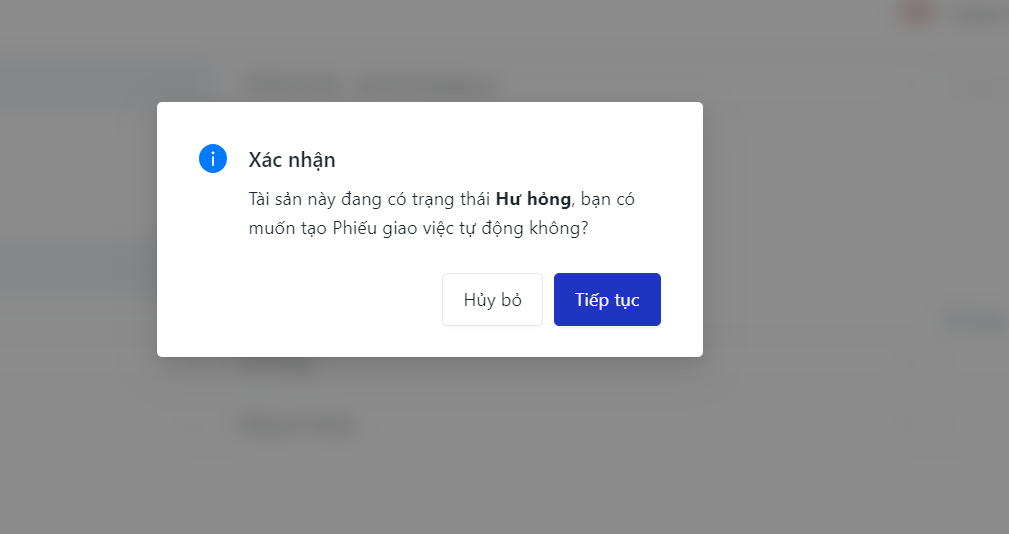 Đối với các trạng thái hư hỏng (B, C, D), hệ thống sẽ hiện thông báo để tạo Phiếu giao việc: • Nếu “hủy bỏ”, hệ thống sẽ không tự động tạo ra Phiếu giao việc. • Nếu “Tiếp tục”, hệ thống sẽ hiển thị màn hình để điền thông tin