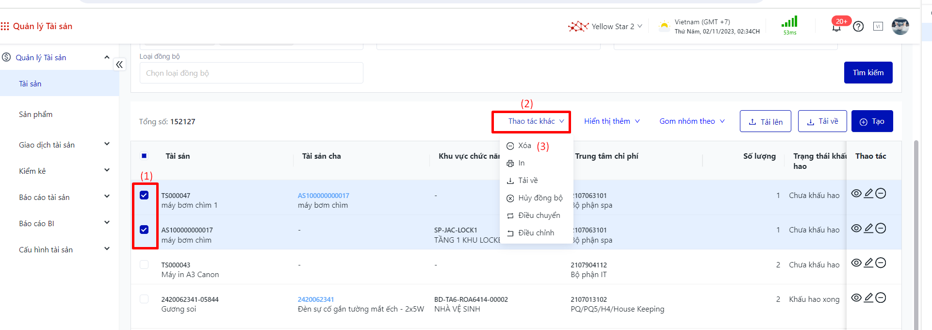 Thao tác khác: tích chọn mã tài sản bất kỳ, sẽ hiển thị mục “Thao tác khác”. Tại mục này người dùng có thể: