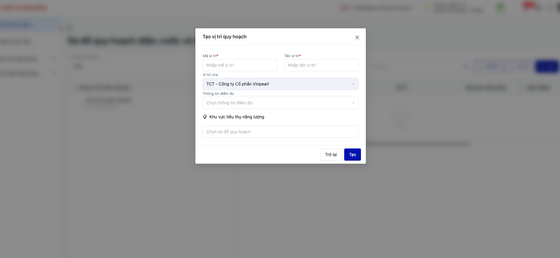 Hệ thống cho phép người dùng tạo vị trí quy hoạch ![]() ![]() Step 1: Tạo vị trí quy hoạch