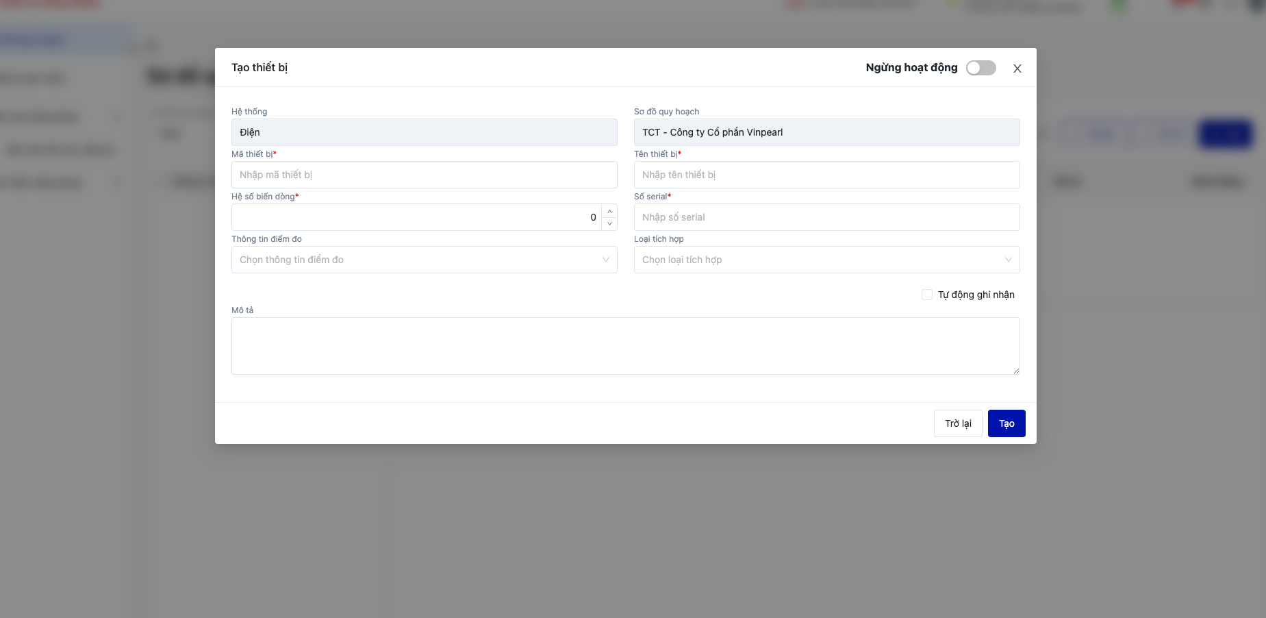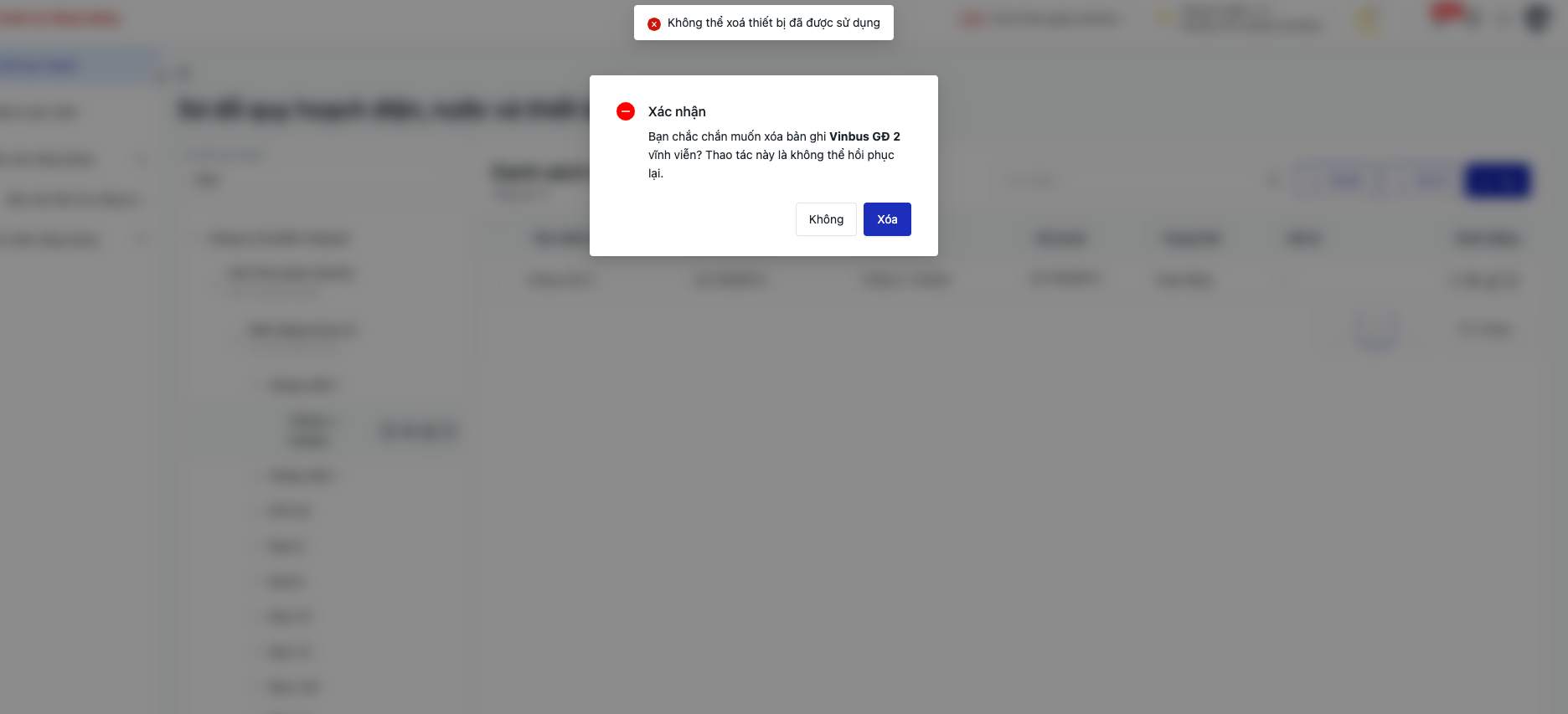 ![]() 2.4. Xoá thiết bị : Thiết bị chỉ được phép xoá khi chưa phát sinh giá trị ghi nhận ( áp dụng cho cả ghi nhận thủ công và ghi nhận tự động) ![]() Nếu đã phát sinh số liệu ghi nhận, hệ thống sẽ không cho xoá và hiển thị thông tin như bên dưới. Click “Không” để đóng pop-up. ![]() 2.5. Tải lên/ tải về thiết bị
