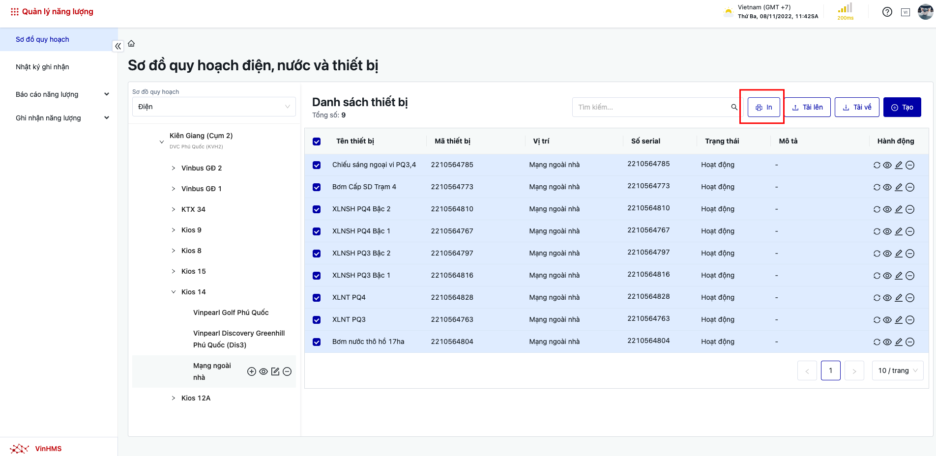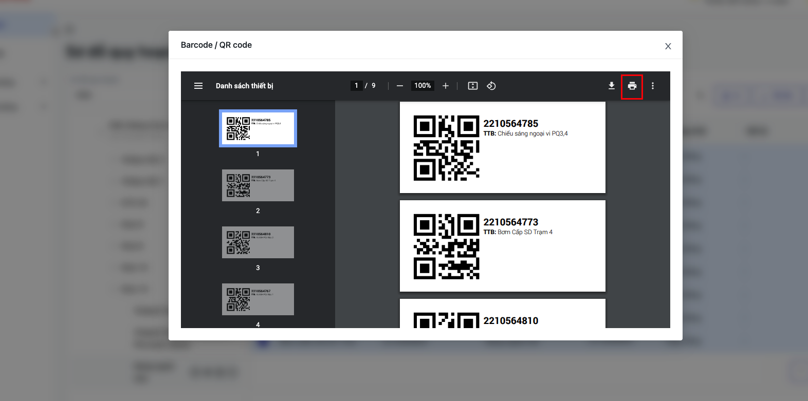 Bước 1: Checkbox chọn tất cả thiết bị cần in ![]() Bước 2: Click chọn “In” , sau đó chọn định dạng mong muốn in bardcode/ QR code ![]() ![]() Bước 3: Kết nối máy in và in tất cả các mã thiết bị tương ứng ![]() |