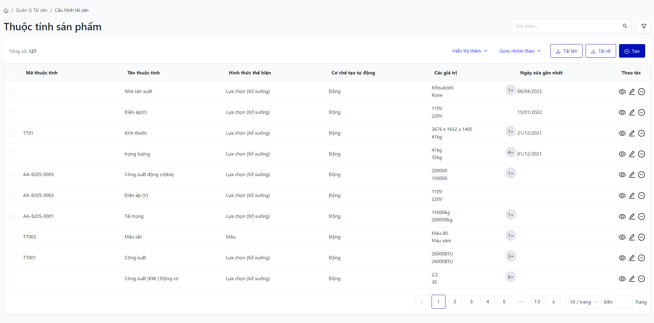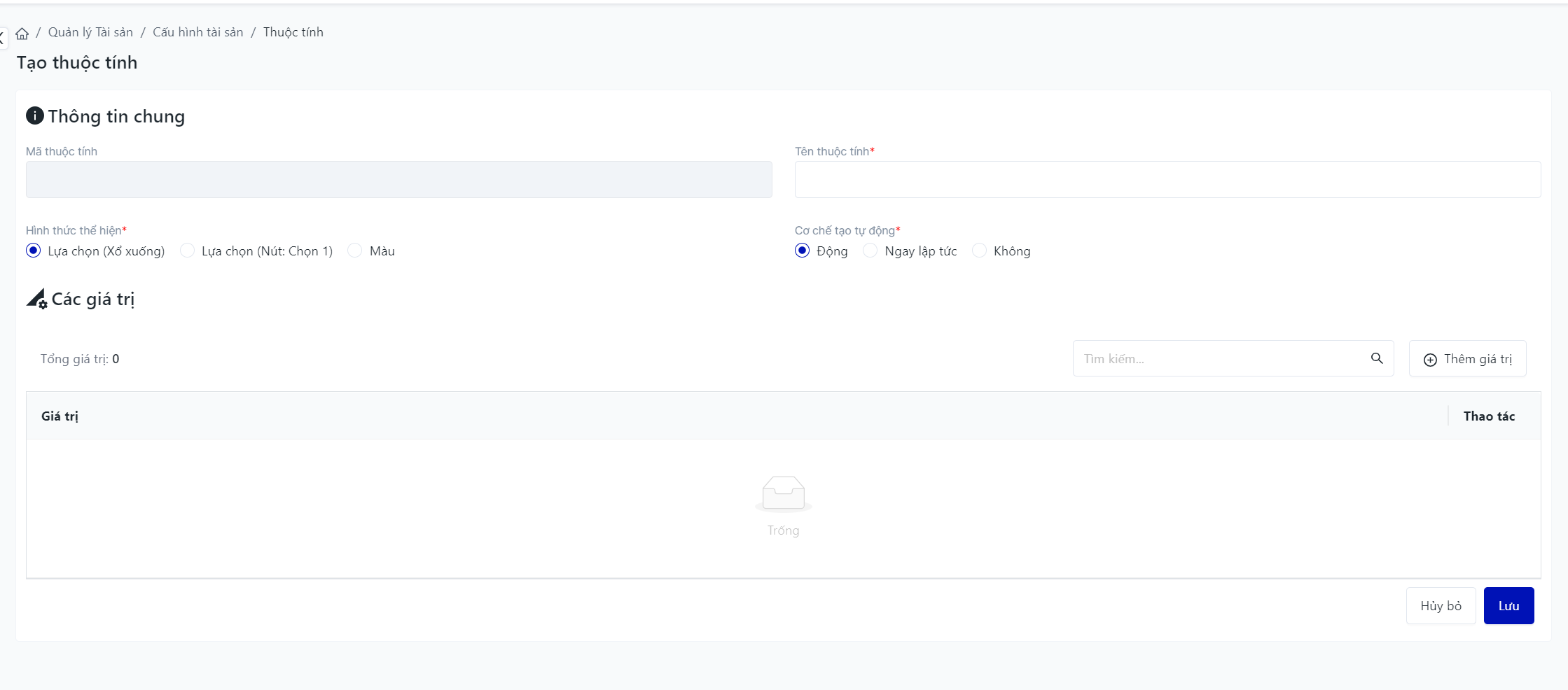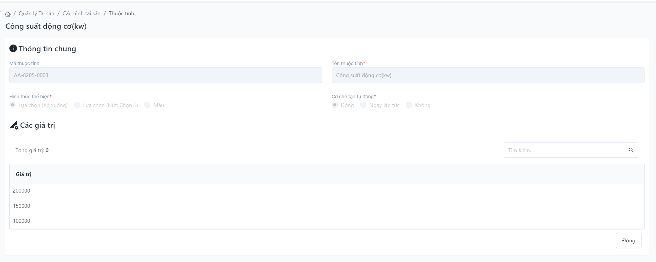 Đăng nhập – Quản lý tài sản – Cấu hình tài sản – Thuộc tính sản phẩm |