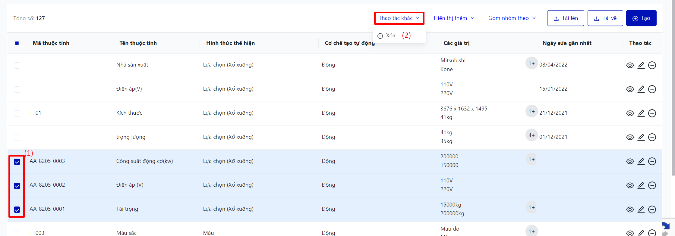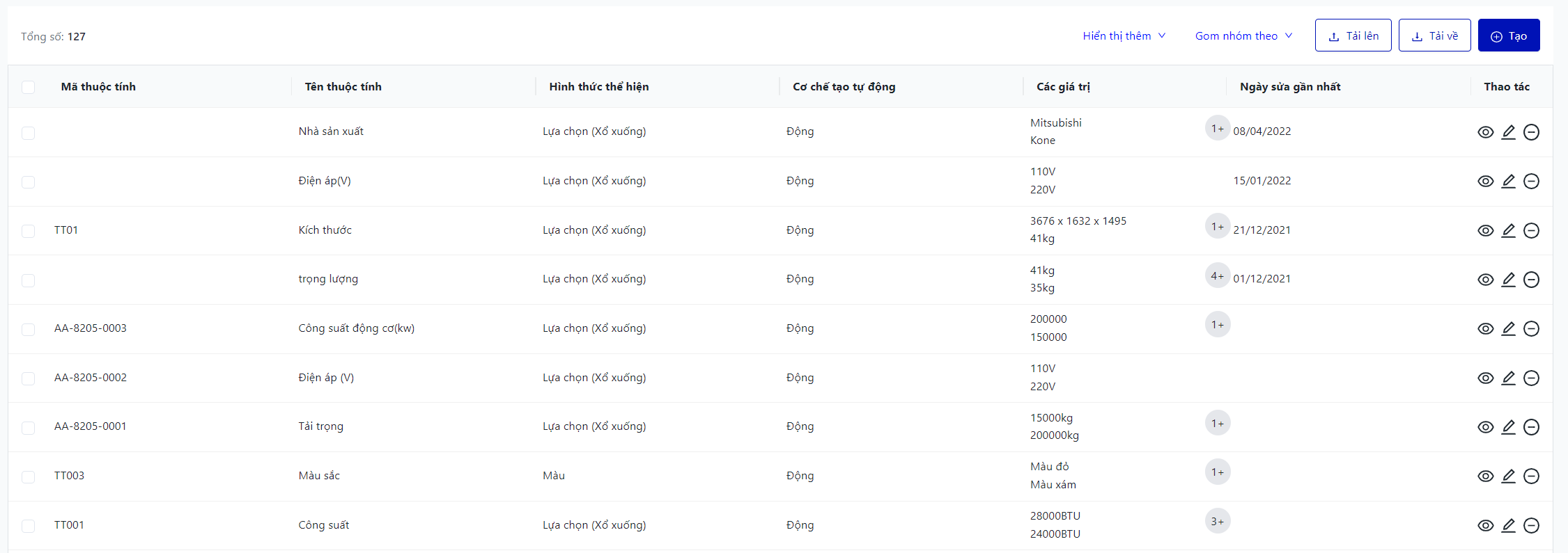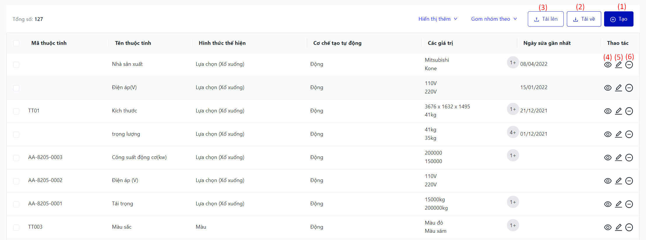Màn hình hiển thị toàn bộ danh sách thuộc tính sản phẩm của cơ sở |
