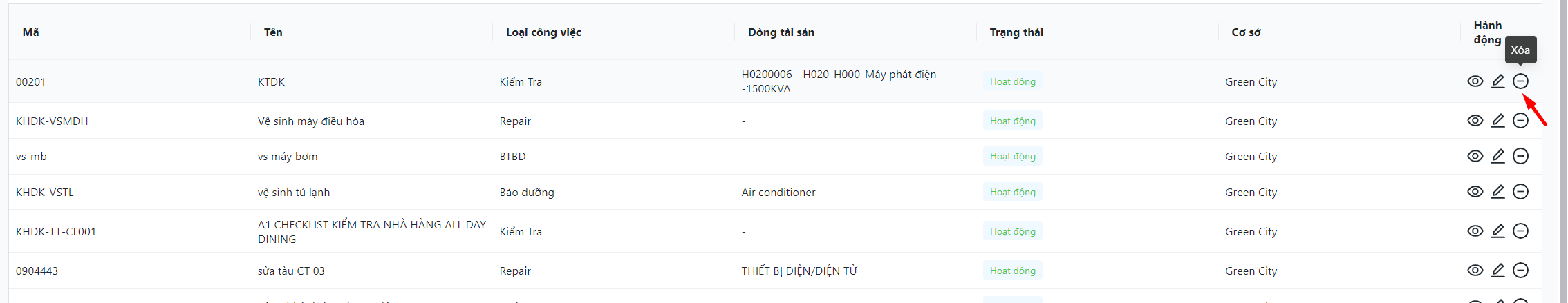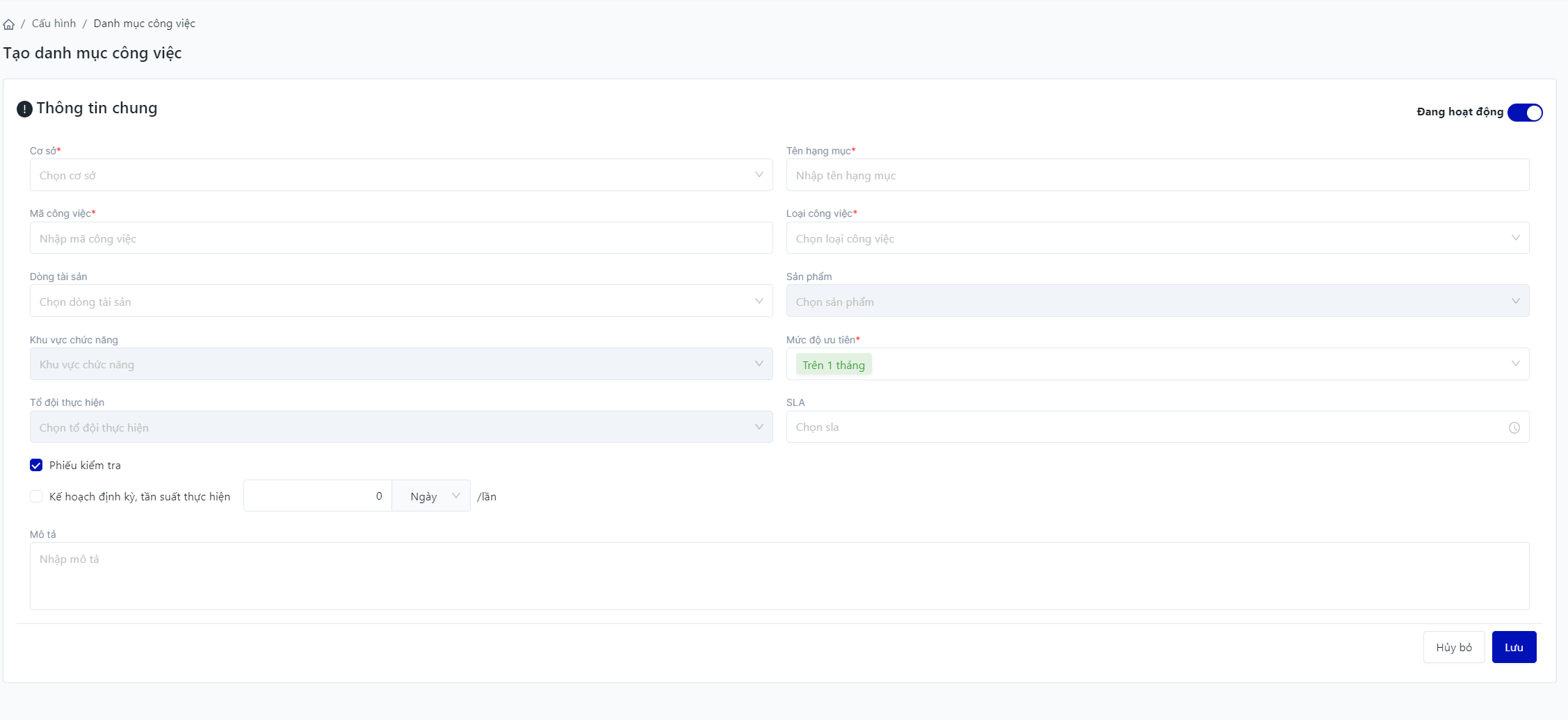 Màn hình hiển thị toàn bộ danh sách danh mục công việc của cơ sở |