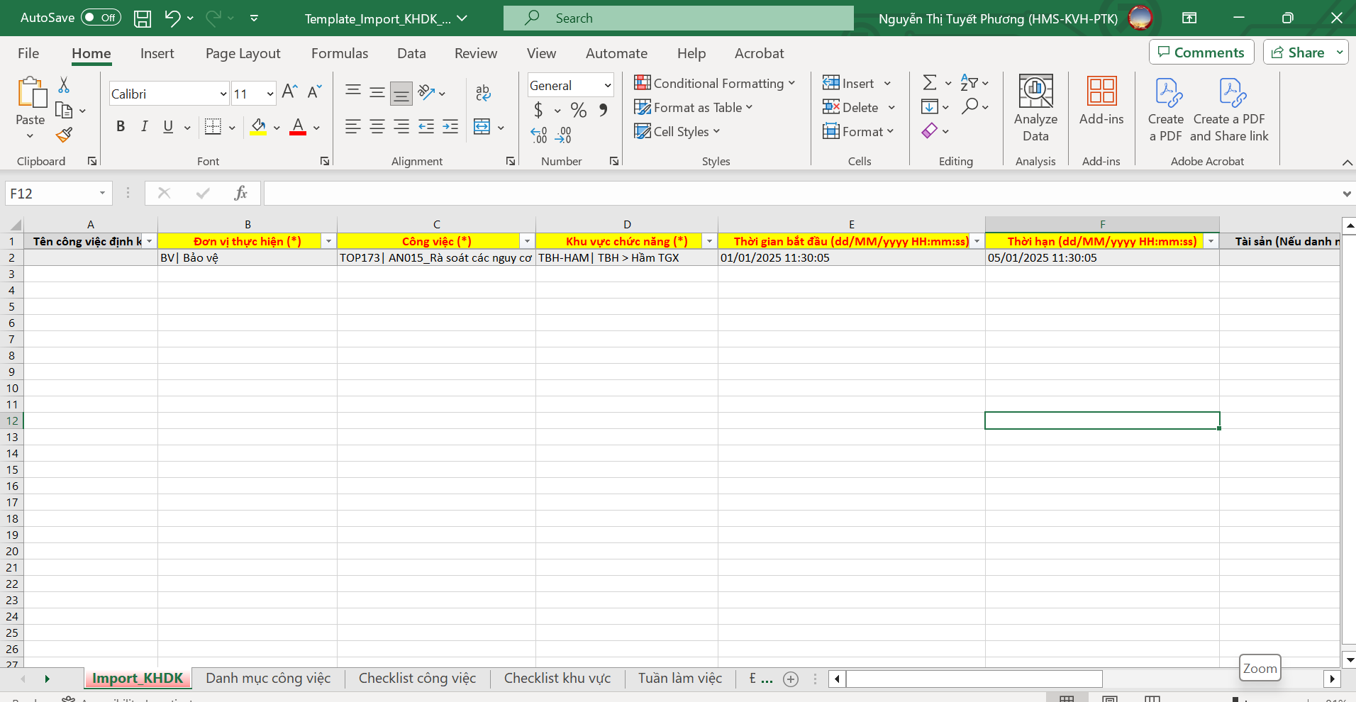 Nhập đầy đủ các trường thông tin (những cột được tô vàng bắt buộc điền thông tin, không được để trống), ở mỗi sheet đều có đầy đủ thông tin liên quan đến danh mục công việc, khu vực chức năng hay tổ đội thực hiện của cơ sở. Lưu ý phải xuất đúng mẫu ở đúng cơ sở đang cần tạo lịch thực hiện để có dữ liệu chính xác nhất.