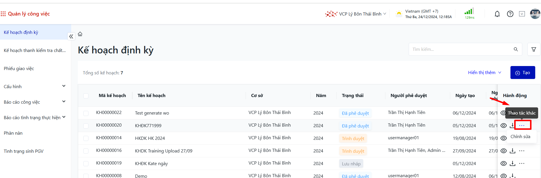 Chỉnh sửa kế hoạch định kỳ trong trường hợp kế hoạch ở trạng thái đã phê duyệt và người dùng được phân quyền chỉnh sửa thì mới sử dụng được chức năng này.