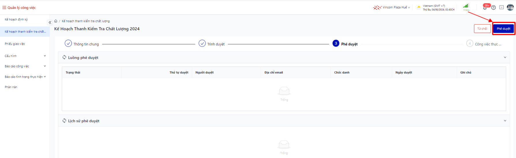 ![]() Bước 3: Nhấn Trình duyệt ![]() Lưu ý: TH1: Người phê duyệt 1 đồng ý phê duyệt kế hoạch, hệ thống sẽ gửi thông báo đến người phê duyệt 2 TH2: Người phê duyệt 1 từ chối phê duyệt kế hoạch sẽ không gửi thông báo đến người phê duyệt 2 => người dùng có thể trình duyệt lại kế hoạch TH3: Người phê duyệt 1 đồng ý, người phê duyệt 2 từ chối => người dùng có thể trình duyệt lại kế hoạch TH4: Người phê duyệt 1 đồng ý, người phê duyệt 2 đồng ý => kế hoạch được phê duyệt thành công sẽ tự động sinh ra công việc