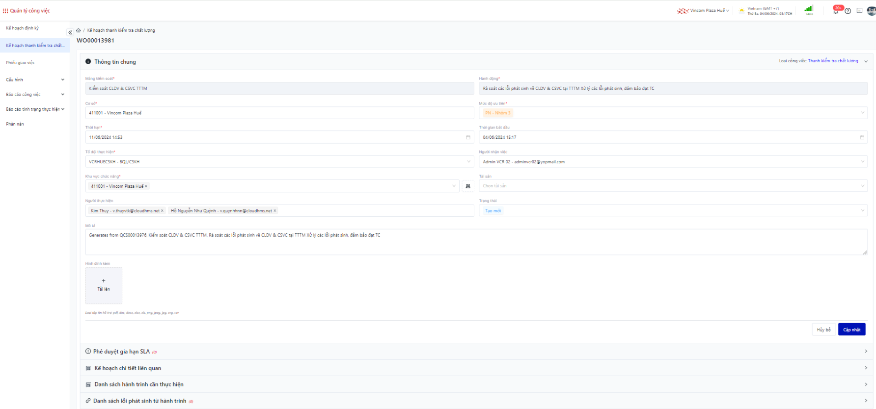 Đăng nhập → Quản lý công việc → Kế hoạch thanh kiểm tra chất lượng |