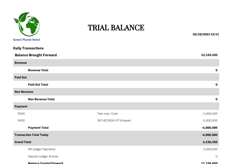 1 | Balance Brought Forward | Balance Carried Forward (xxx) figure from the previous days trial balance/ cân bằng số liệu được chuyển tiếp từ bản cân đối thử những ngày trước |