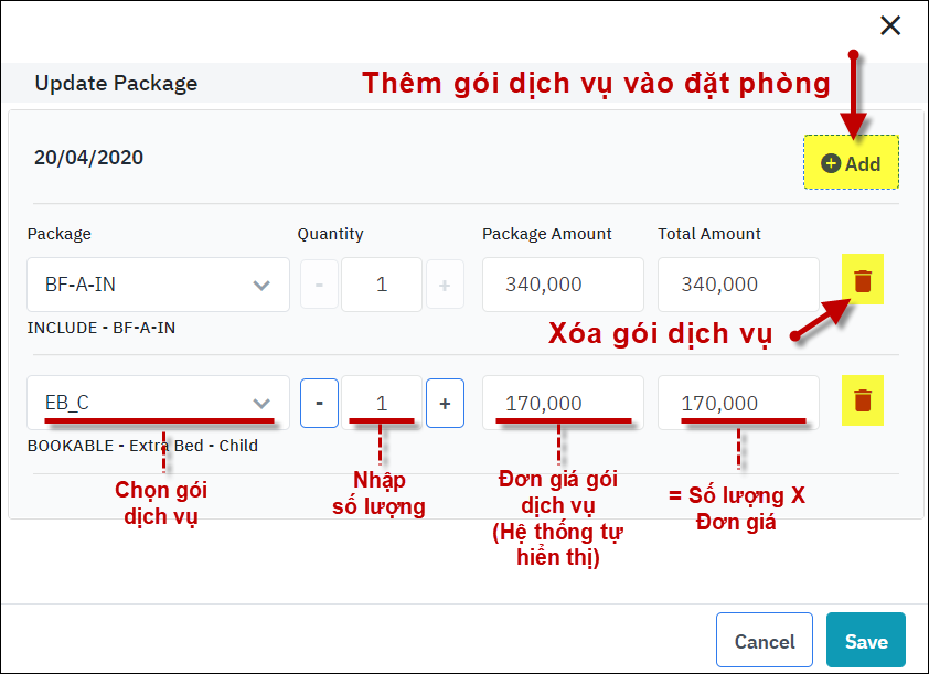 Gói dịch vụ/Packages: Tổng tiền của các gói dịch vụ. Tích vào trường số tiền để xem chi tiết danh sách các gói dịch vụ của đặt phòng