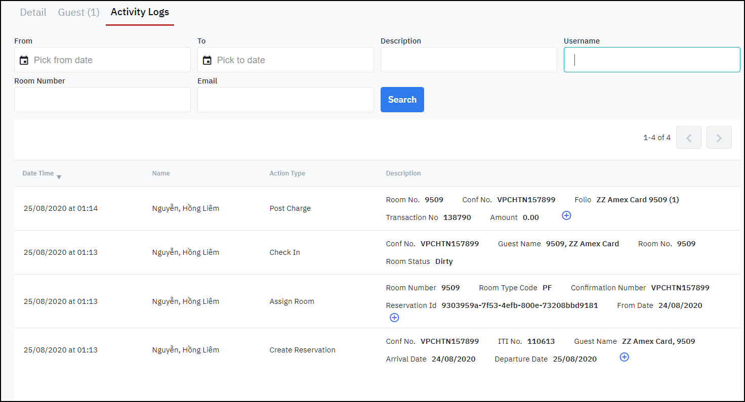 Room number/Số phòng: Chọn số phòng của booking cần tìm lại lịch sử thao tác của người dùng
