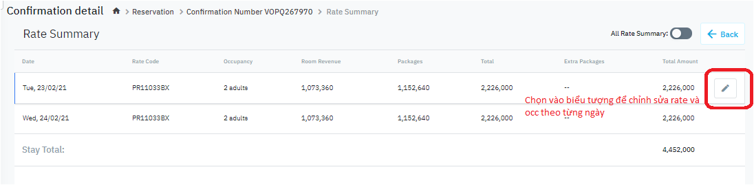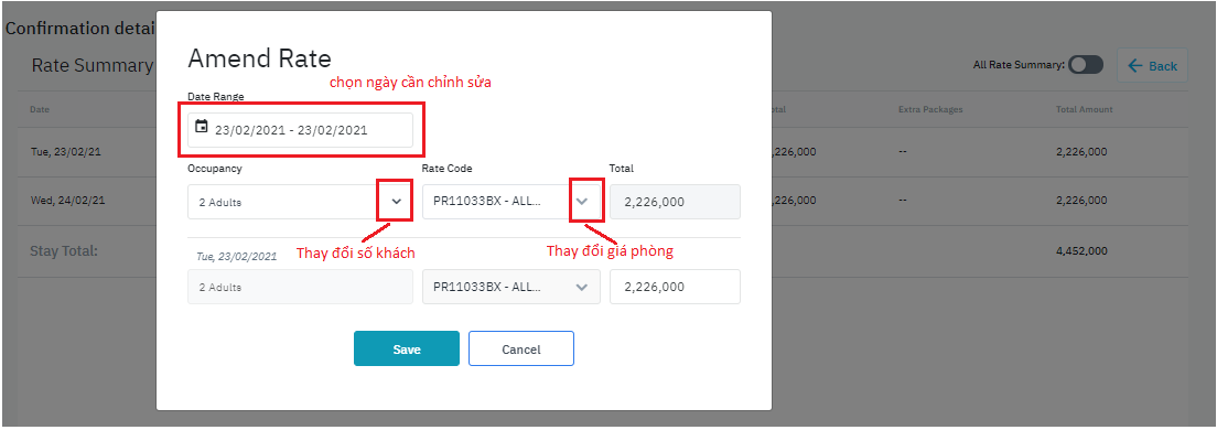 (1) Sửa giá phòng hoặc số khách theo ngày/Edit Rate Amount: Sửa trực tiếp giá trên màn hình Rate Summary