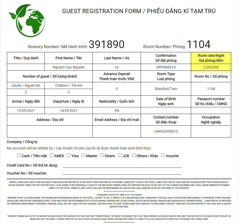 Giá phòng/Total: Tổng tiền 1 đêm phòng