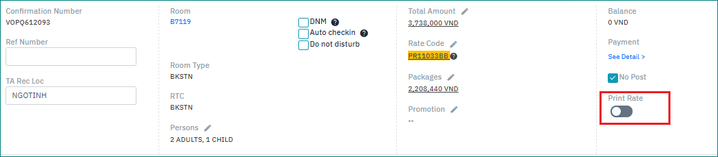 ( * ) Tại màn hình Confirmation Detail, khi người dùng bật button Print Rate, thì giá phòng sẽ được hiển thị trên phiếu Guest Registration Form và Billing Information