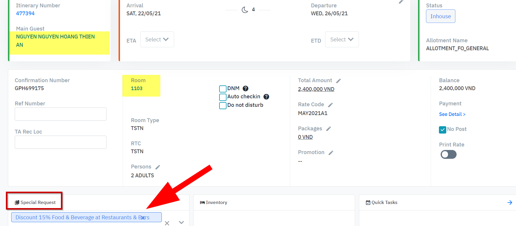 Khi chọn các yêu cầu Special Request bên CiHMS PMS: