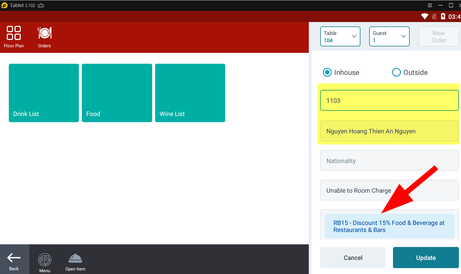 Thông tin này sẽ hiễn thị bên CiHMS FnB/POS khi waiter/waitress kiểm tra thông tin thực khách là in-house guest
