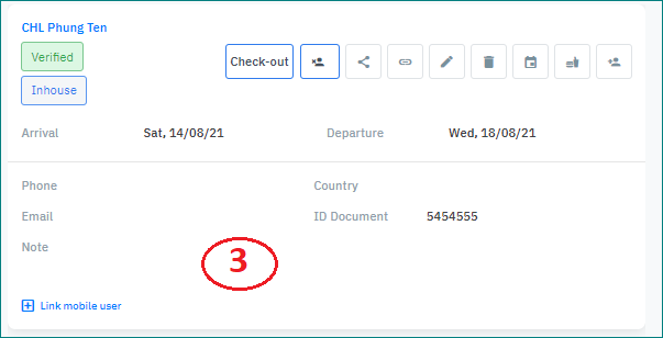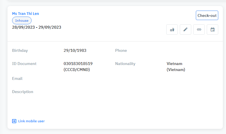 Link mobile user: Trường hợp khách có tài khoản sửa dụng trên app My Vinpearl, nhấn nút này tìm kiếm và link tài khoản VPE với hồ sơ khách phục vụ giao tiếp dữ liệu giữa 2 hệ thống