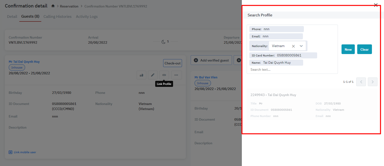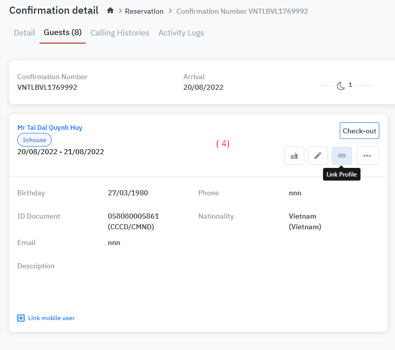 Tại màn hình Confirmation details → Tab guests → Bấm chọn vào biểu tượng “link profile”