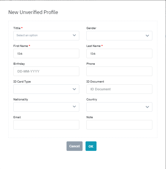 Chưa xác minh/Unverified: Tên khách hiển thị màu đen, chưa liên kết tới 1 hồ sơ khách cụ thể nào trong hệ thống.