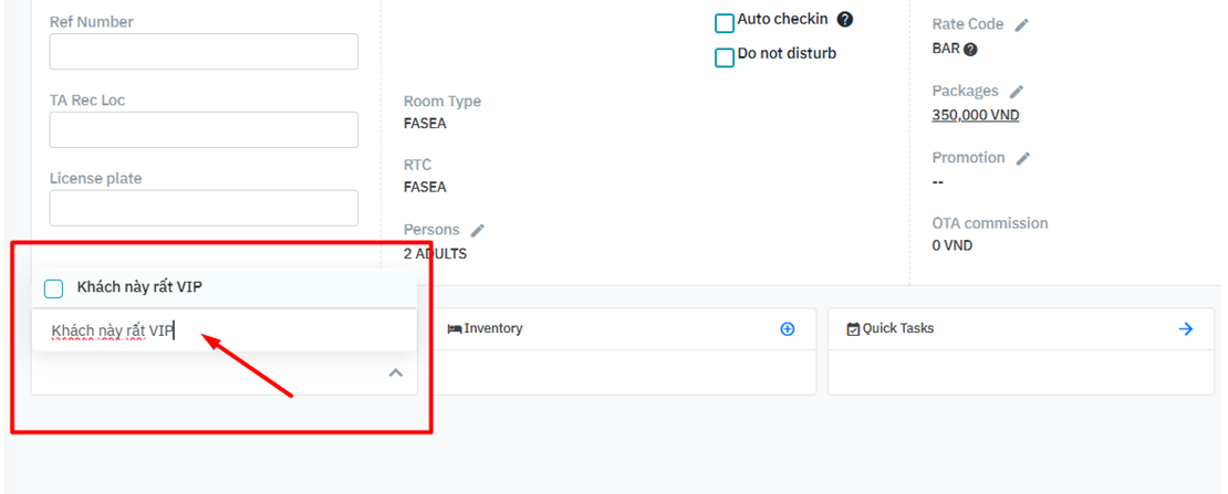 Do not disturb: Tích chọn nếu đặt phòng này không cho phép làm phiền. Khi tích chọn vào nút này thì hệ thống sẽ ngắt các cuộc gọi lên phòng để tránh làm phiền khách